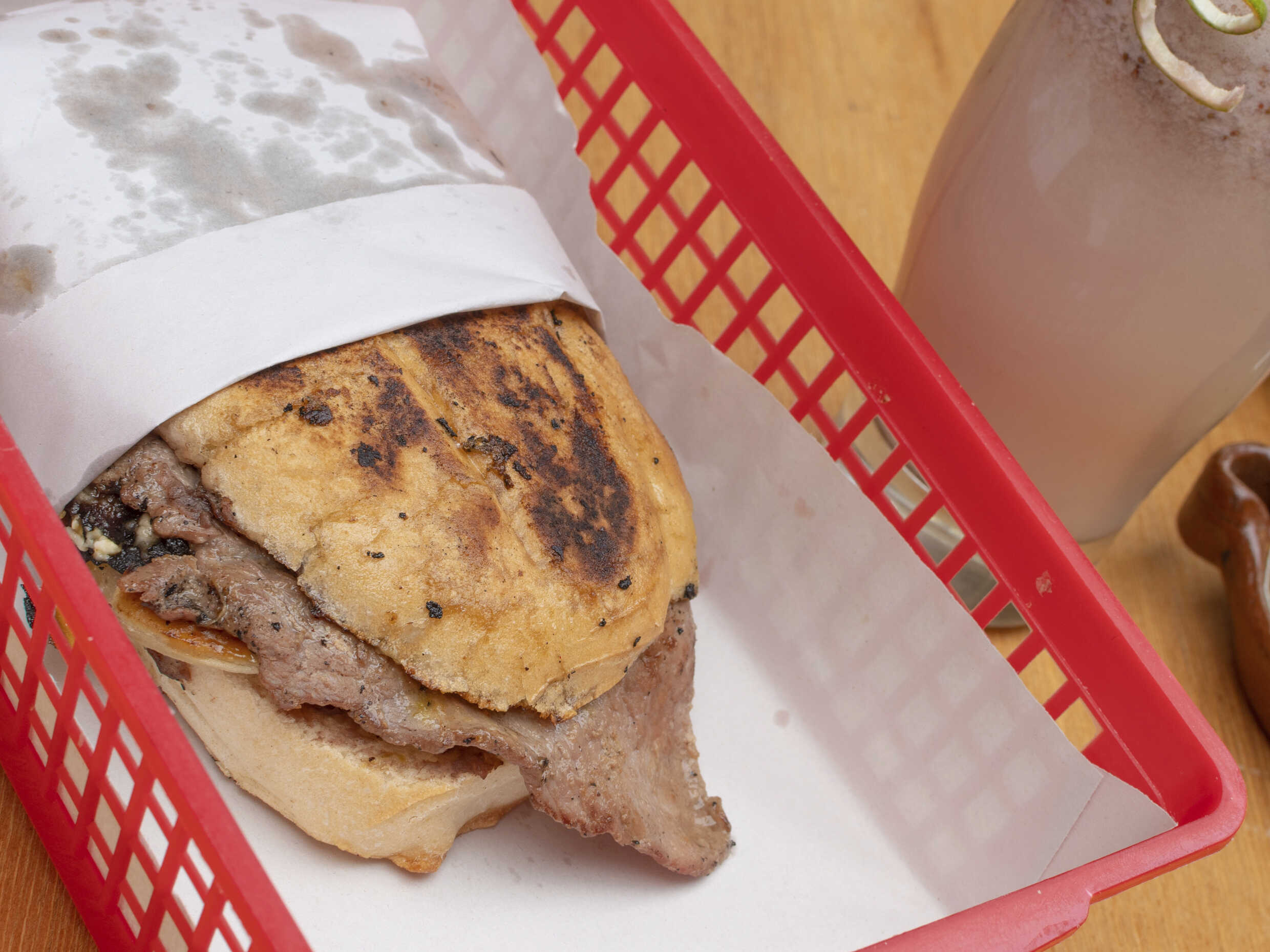 Porción personal: Guajolote de arrachera preparado con telera la cual se parte a la mitad, se le unta en ambas tapas frijol, se le ponen dos enchiladas que son como chalupas (se fríen dos tortillas de maíz 2 piezas, se les unta salsa verde, queso cotija esparcido y cebolla) se le agrega 60 gr de arrachera y se agrega un extra de salsa, se cierra la telera y se fríe.