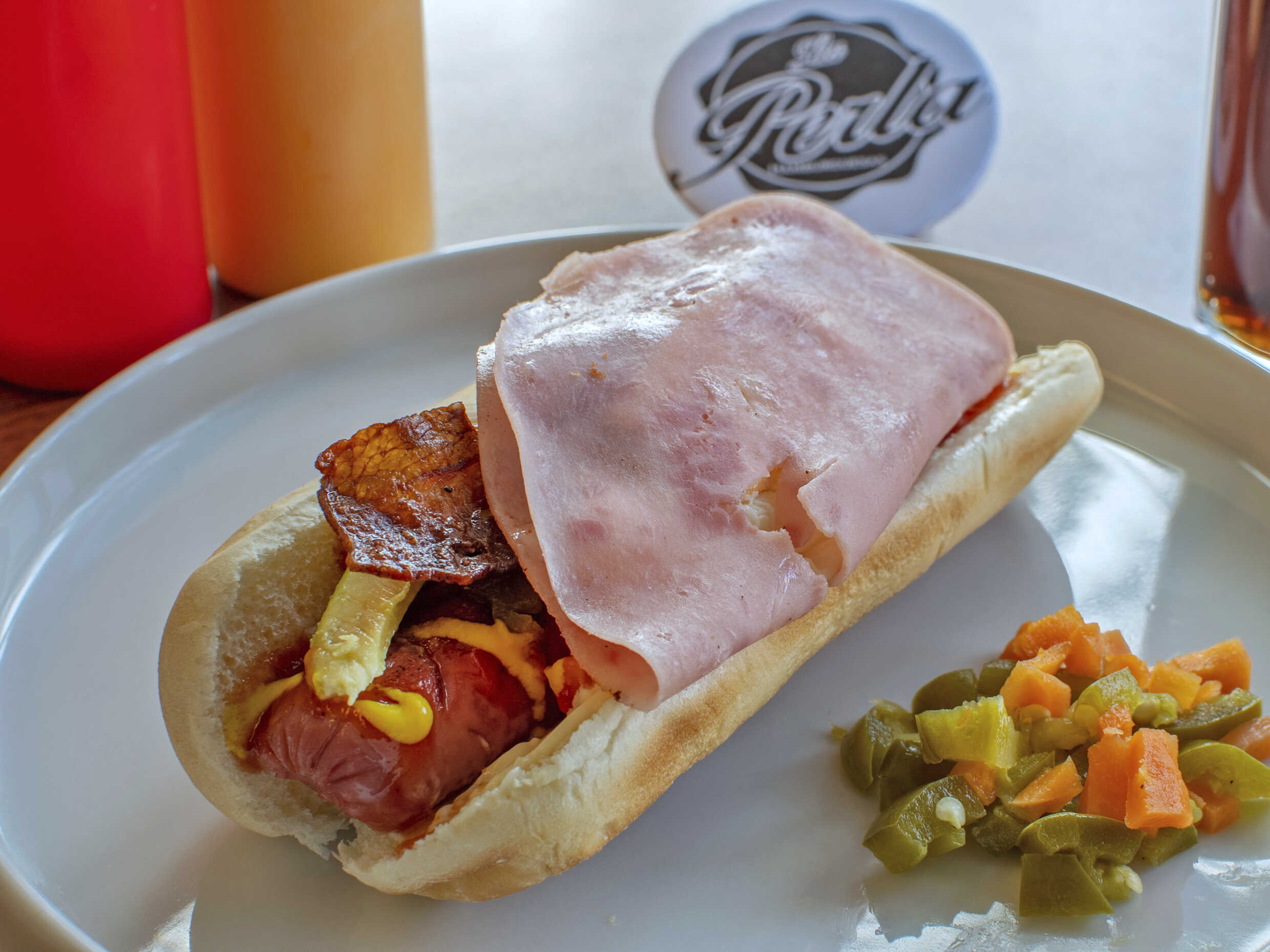 Salchicha de pavo, tocino, jamon con queso oaxaca y americano, mayonesa, catsup, mostaza jitomate cebolla, jalapeño y aguacate