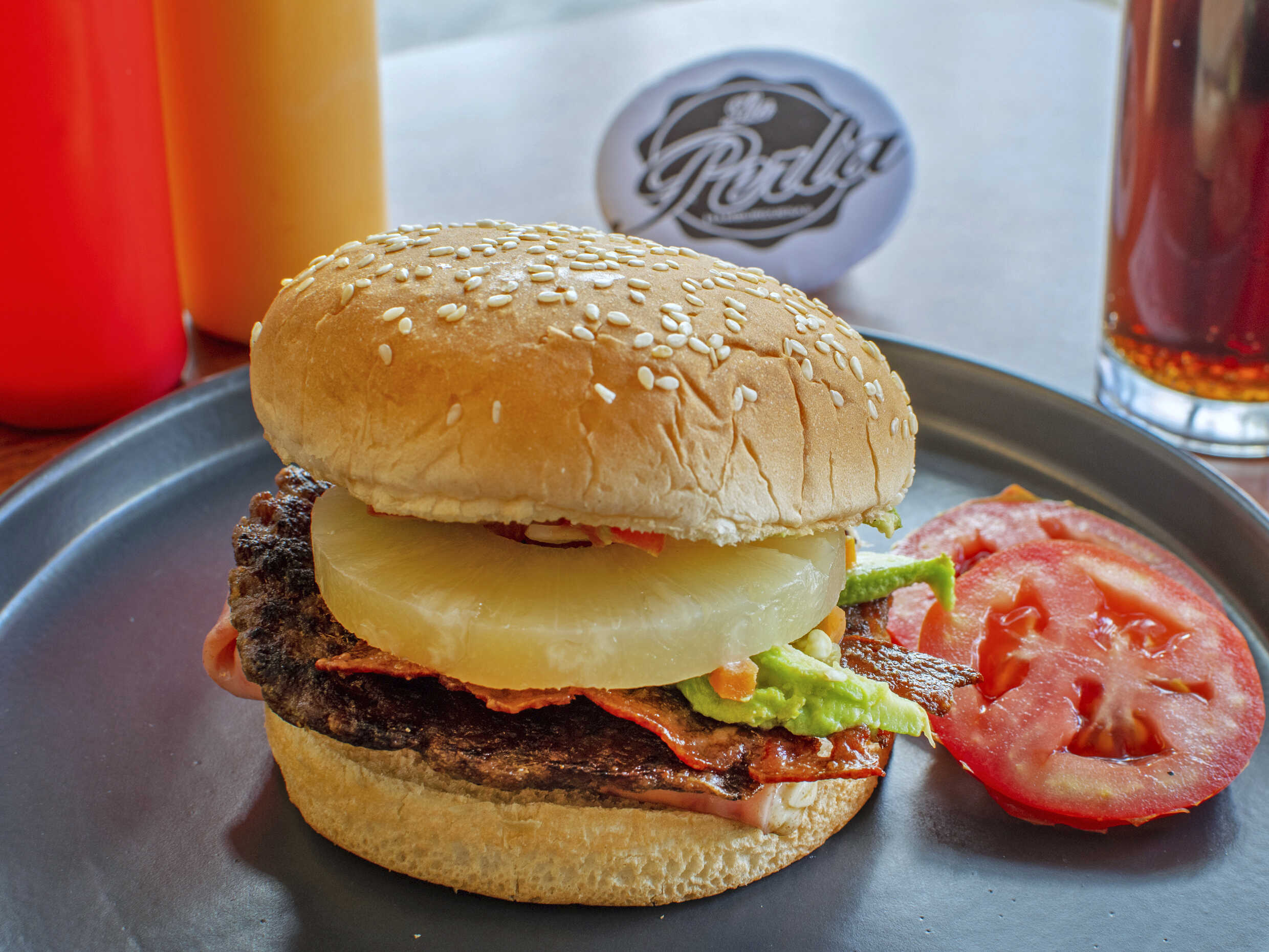 Piña en almibar cocida,carne de res, tocino y jamon con queso oaxaca y americano. Lleva Mayonesa, catsup, mostaza jitomate cebolla jalapeño y aguacate