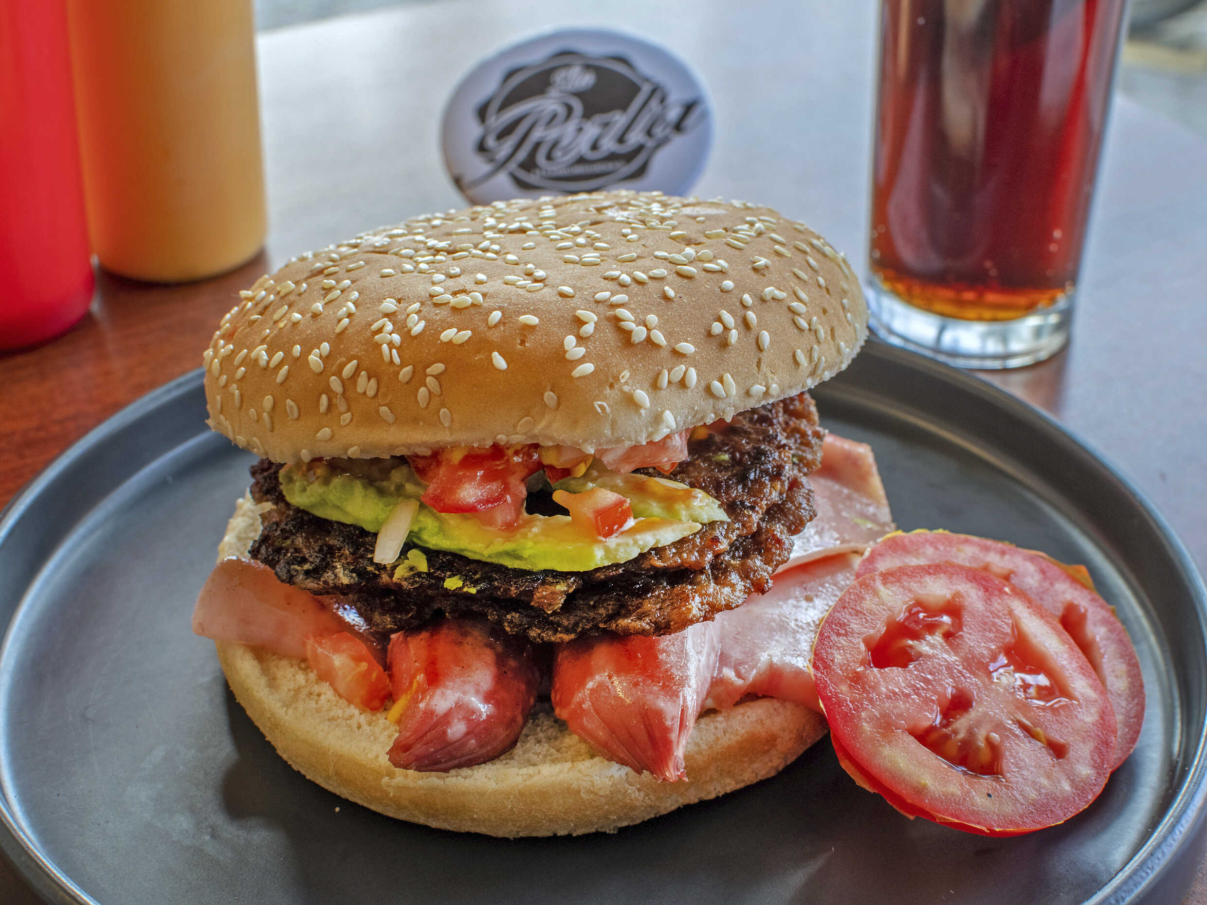 Doble Carne de Res, tocino y jamón con Queso oaxaca y americano, Lleva Mayonesa, catsup, mostaza jitomate cebolla jalapeño y aguacate