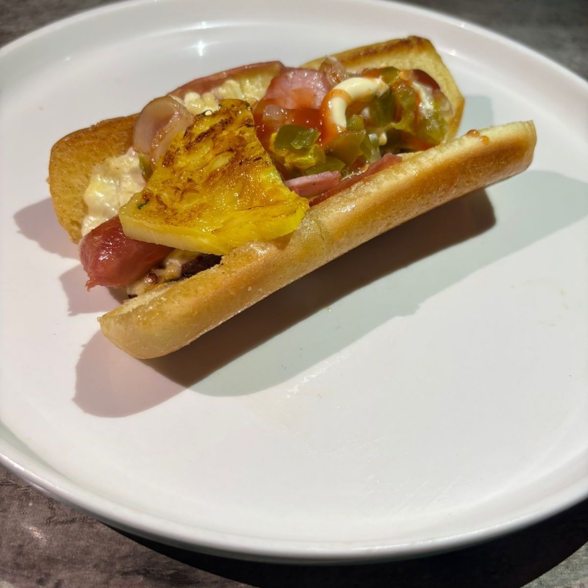 Salchicha, tocino, jamón, jitomate, piña, cebolla caramelizada, aderezos (catsup, mayonesa, mostaza), chiles en vinagre.
