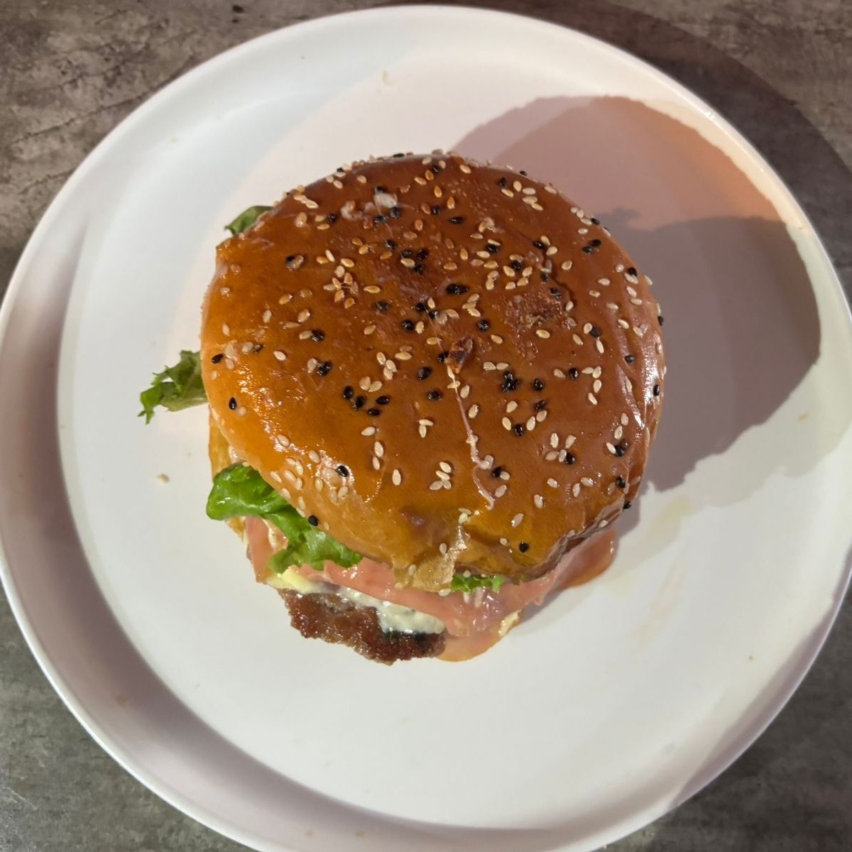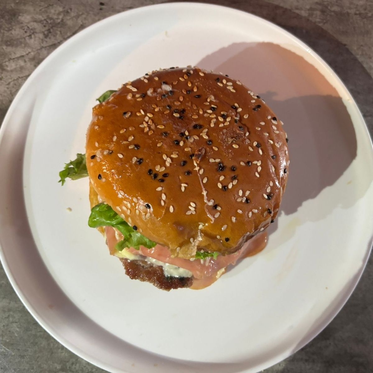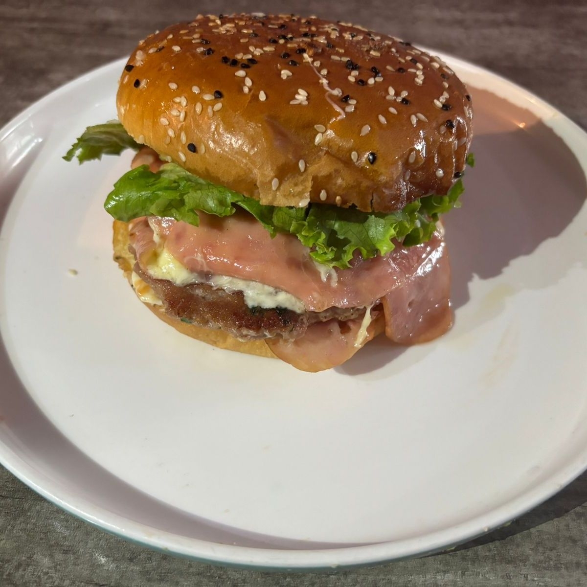 Aderezos (catsup, mayonesa y mostaza), lechuga, jitomate, cebolla caramelizada, doble carne, doble jamón, doble tocino, doble mix de quesos (manchego, mozzarella y Oaxaca)