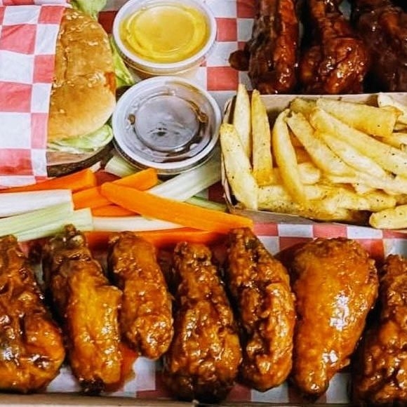 6 piezas de alitas sobre una cama de lechuga, bañadas con salsa búfalo, acompañadas con zanahoria y pepino.