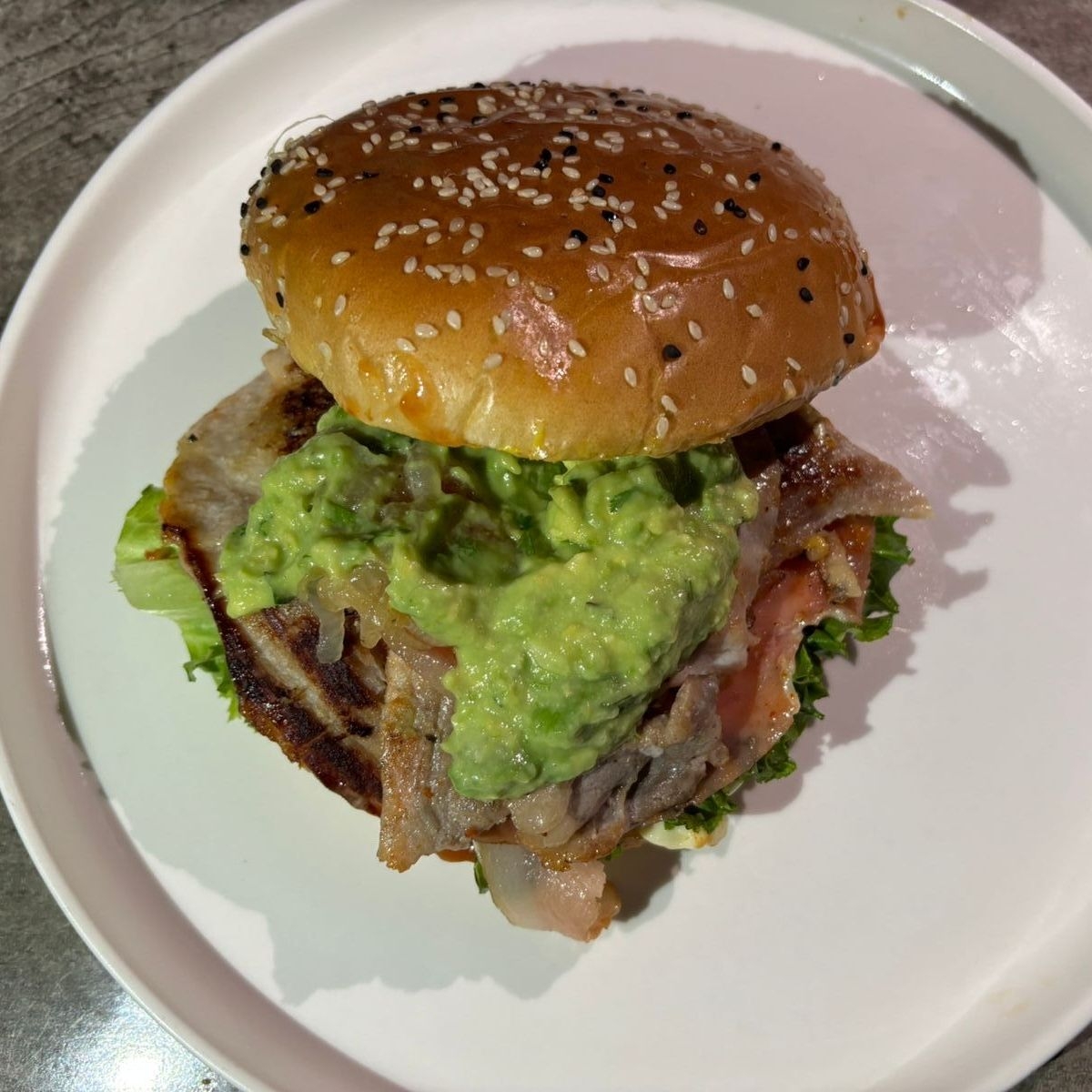 Aderezos (catsup, mayonesa y mostaza), lechuga, jitomate, cebolla caramelizada, bistec asado, jamón, tocino, mix de quesos (manchego, mozzarella y Oaxaca) y guacamole.
