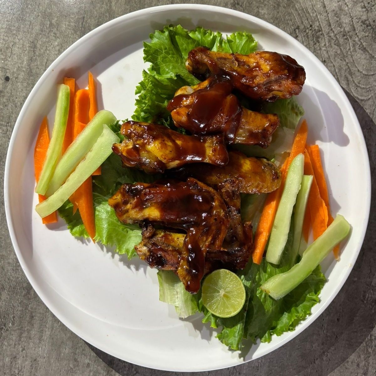 6 piezas de alitas sobre una cama de lechuga, bañadas con salsa BBQ, acompañadas con zanahoria y pepino.