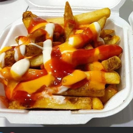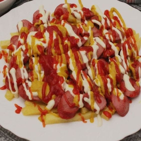 Papas naturales bañadas en aderezos (catsup, salsa picante, mayonesa y queso amarillo)