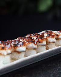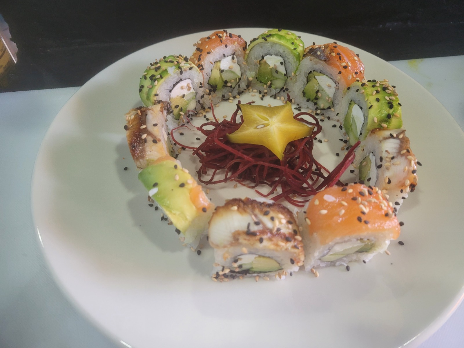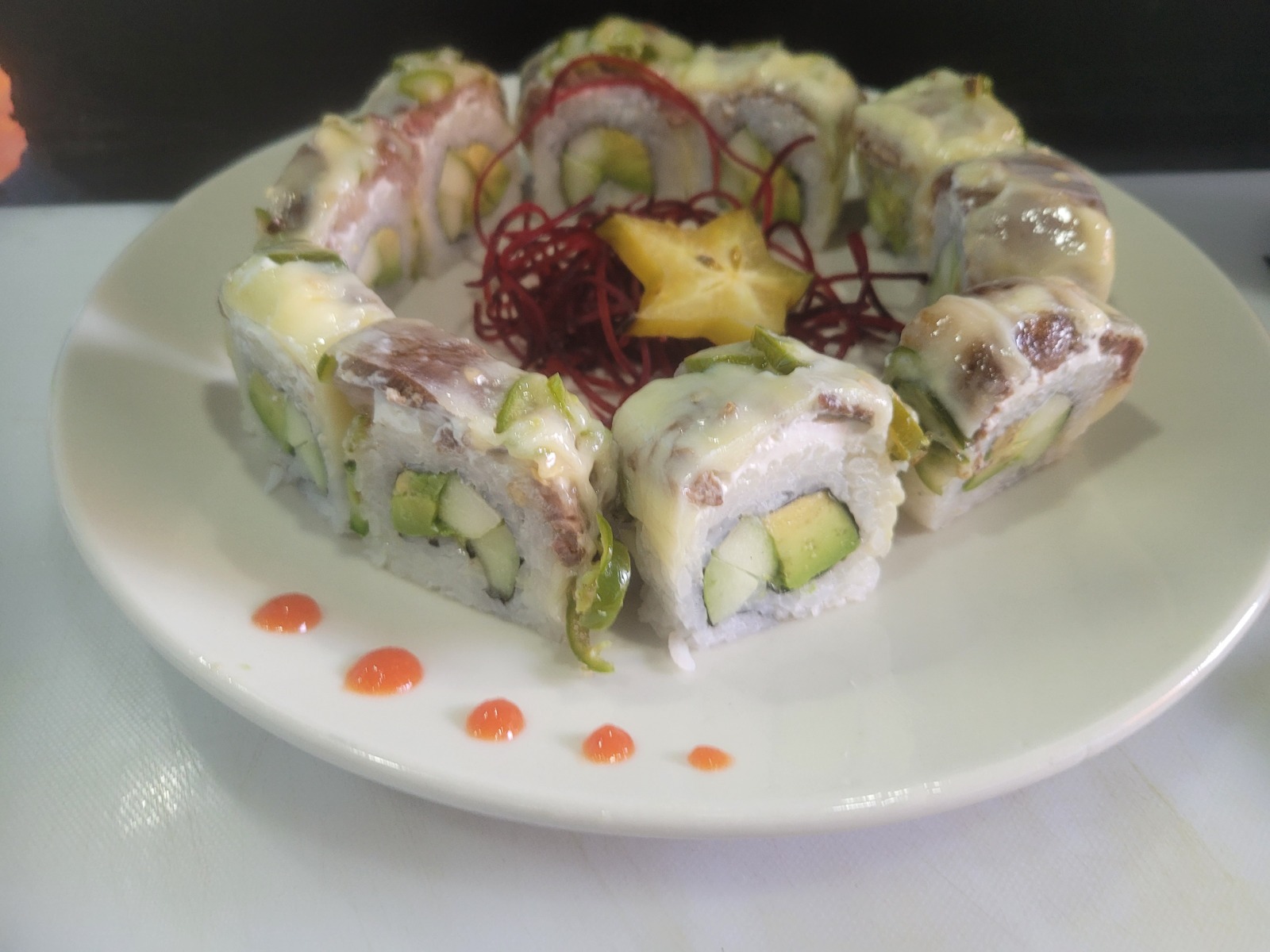 Nori, anguila de rio, pepino, massago, queso crema, aguacate, salsa dulce, y ajonjoli