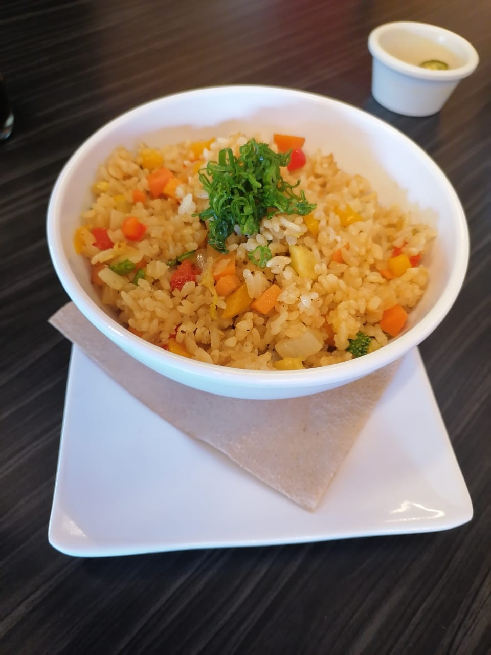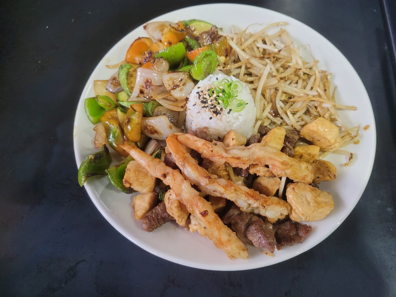 Arroz frito con verduras, pollo, res, camarón, queso crema, aguacate, tampico y cebollin