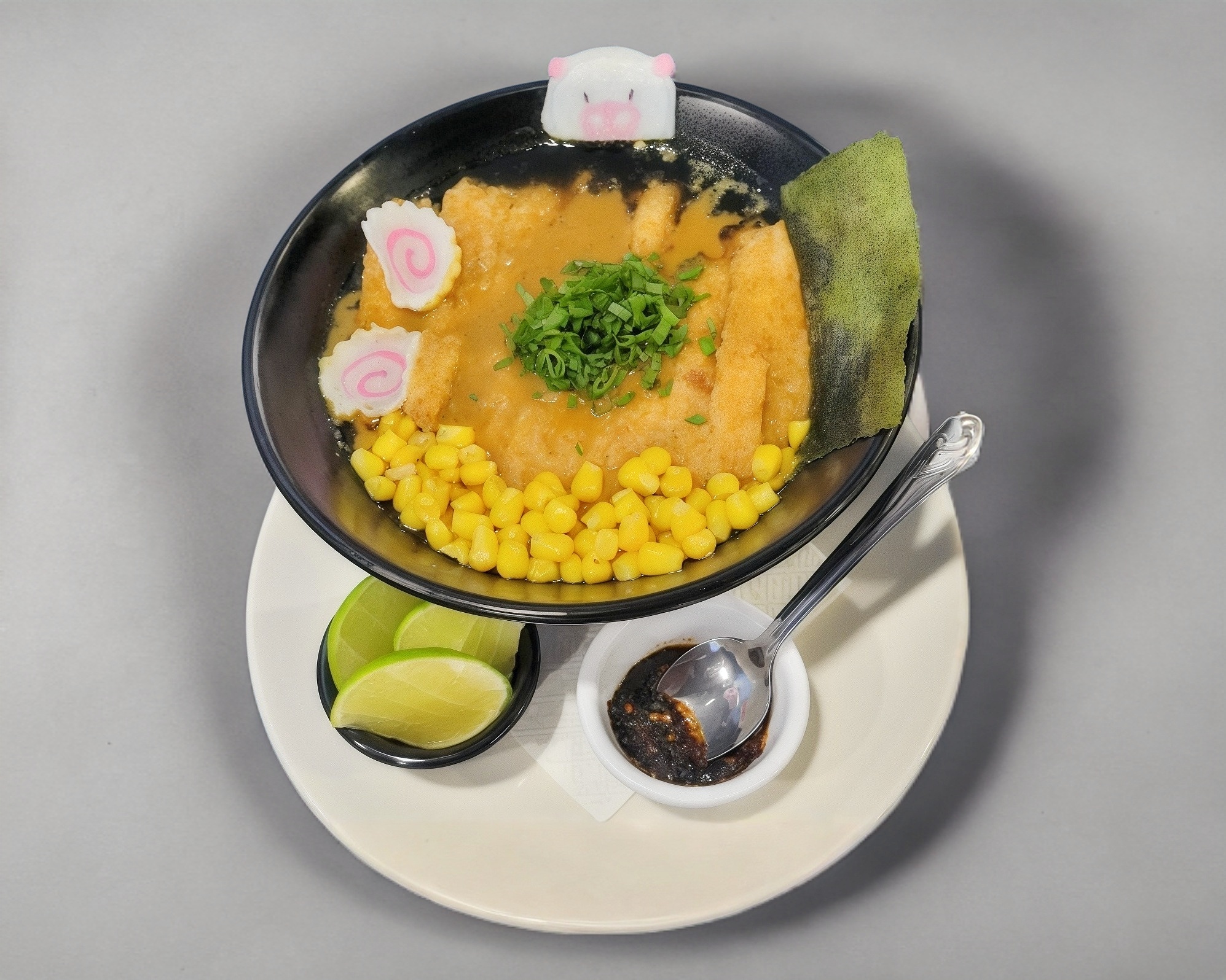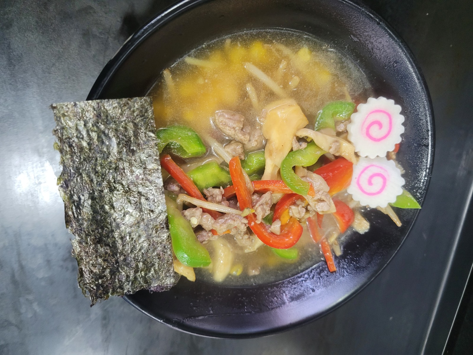 Sopa de fideos sabor a soya, filete de res, champiñon, cebolla, germen de soya, pimiento, zeta y elote