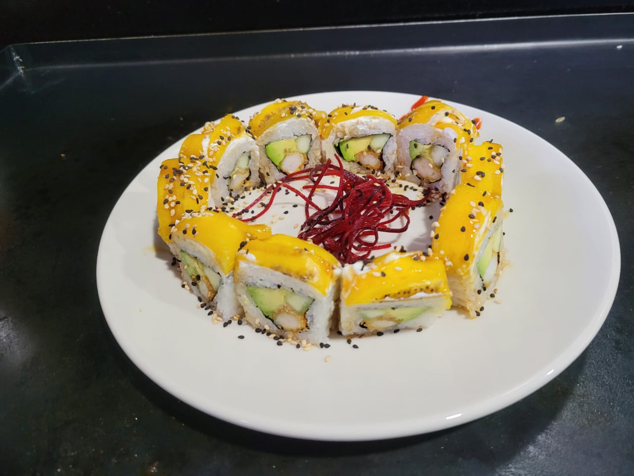 Camarón capeado, pepino, aguacate, queso crema, mango bañado en salsa con ajonjoli