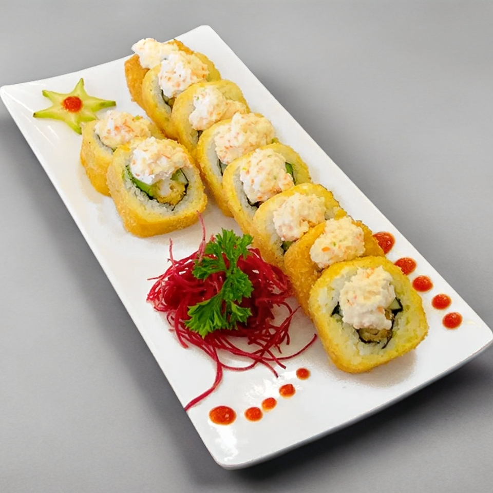 Surimi, pepino, ques crema, aguacate capeado, con salsa dulce chipotle y ajonjoli