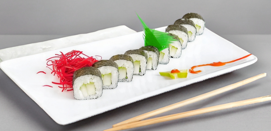Nori, surimi, pepino, aguacate, arroz, ajonjoli