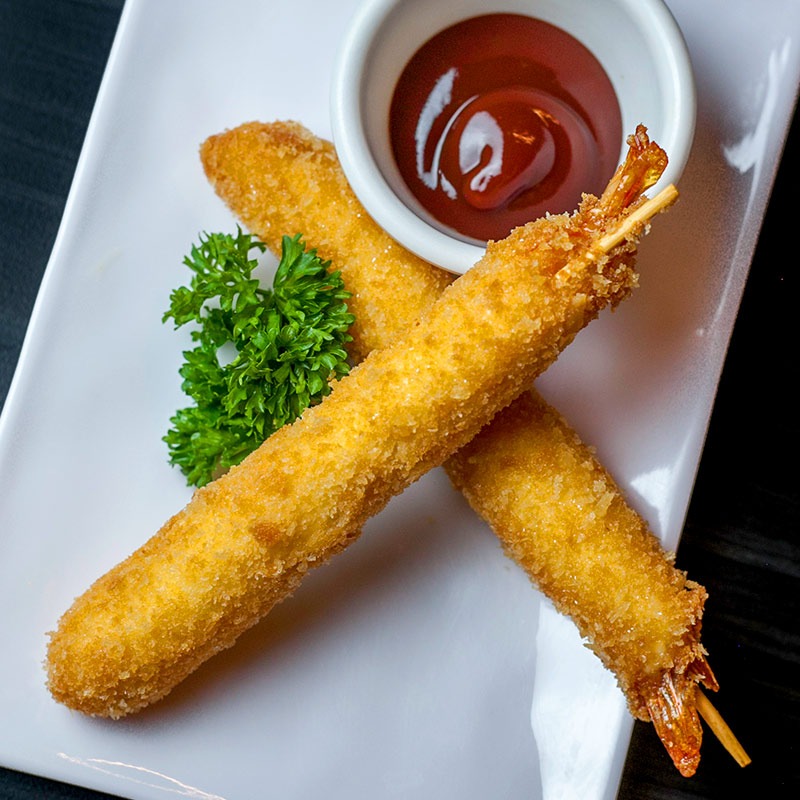 Camarón capeado, pepino queso crema, platano macho, frito bañado, bañado en sasa dulce y ajonjoli