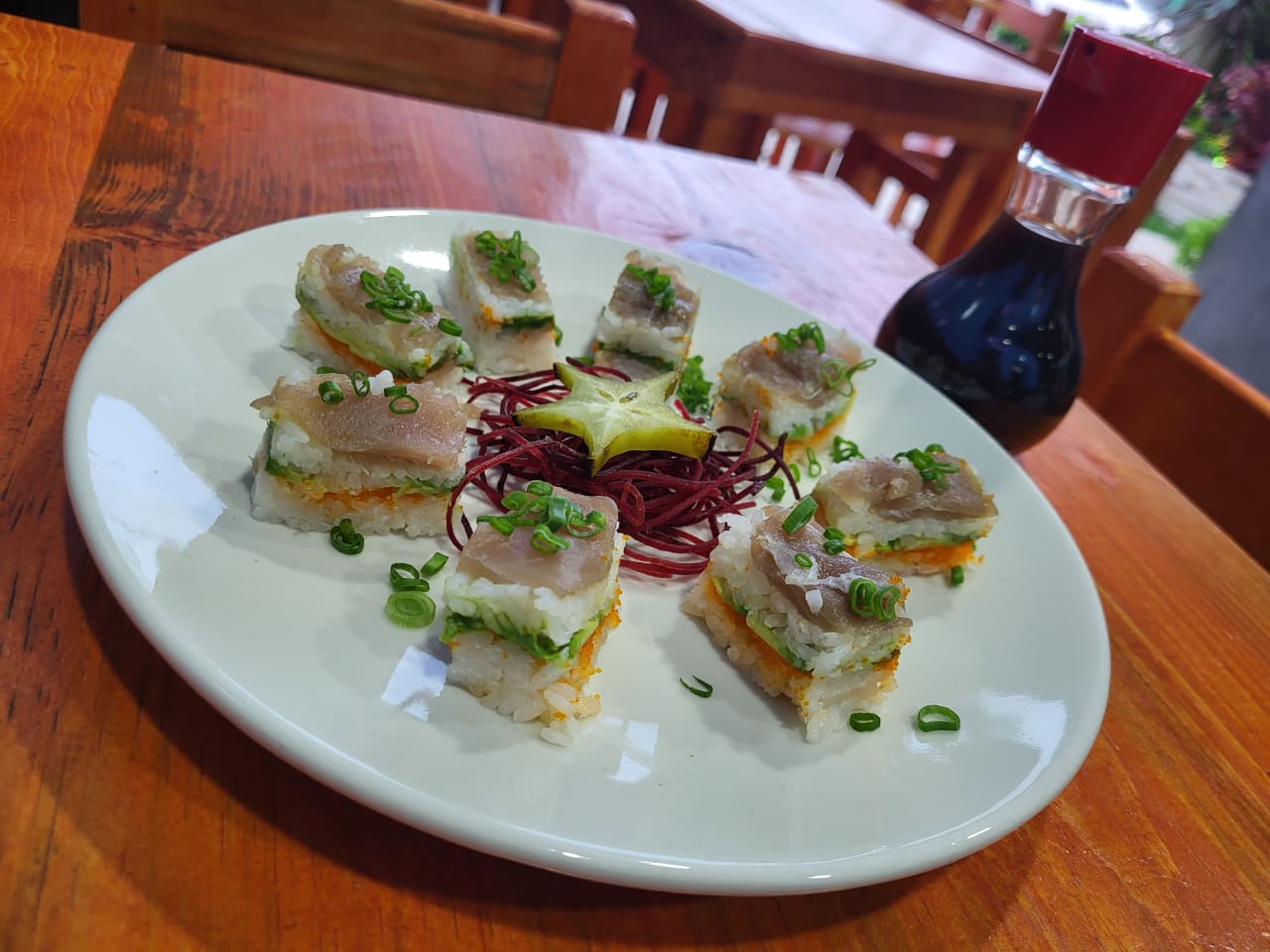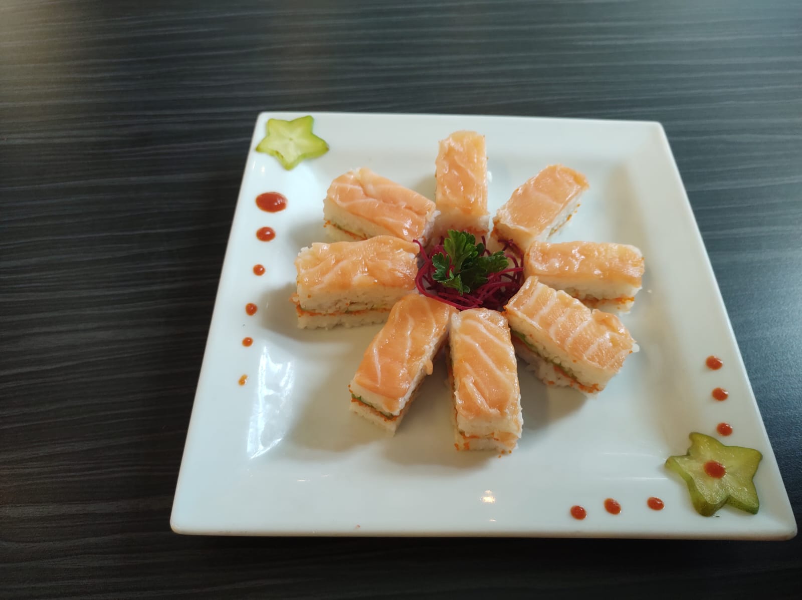 Sushi realizado en molde japones con massago, aguacate, cebollin y salmón