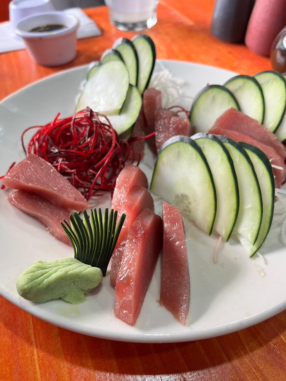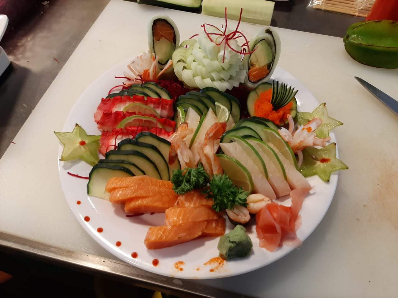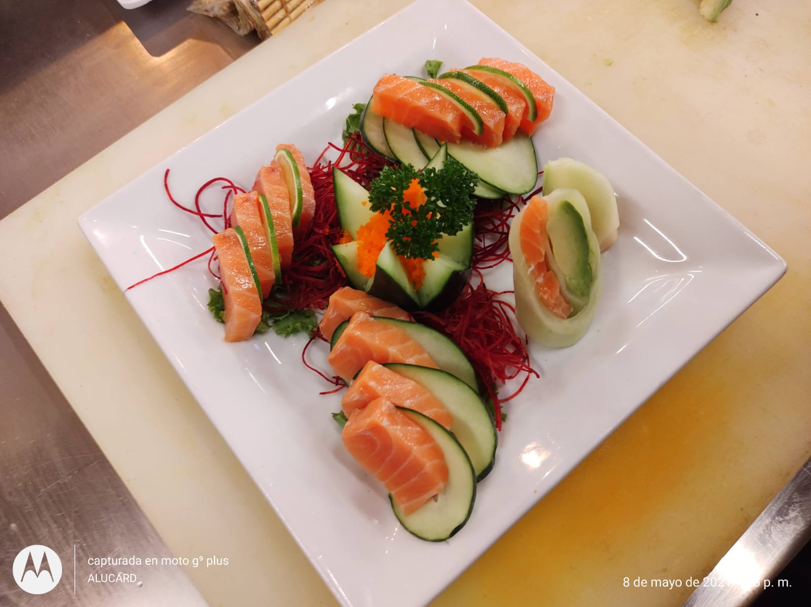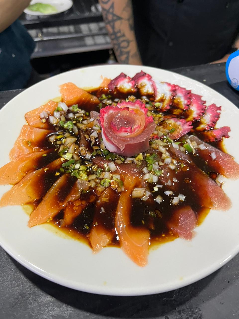 Pulpo, pepino aguacate, salmón flamedo con salsa ajipon, cebollin y ajonjoli