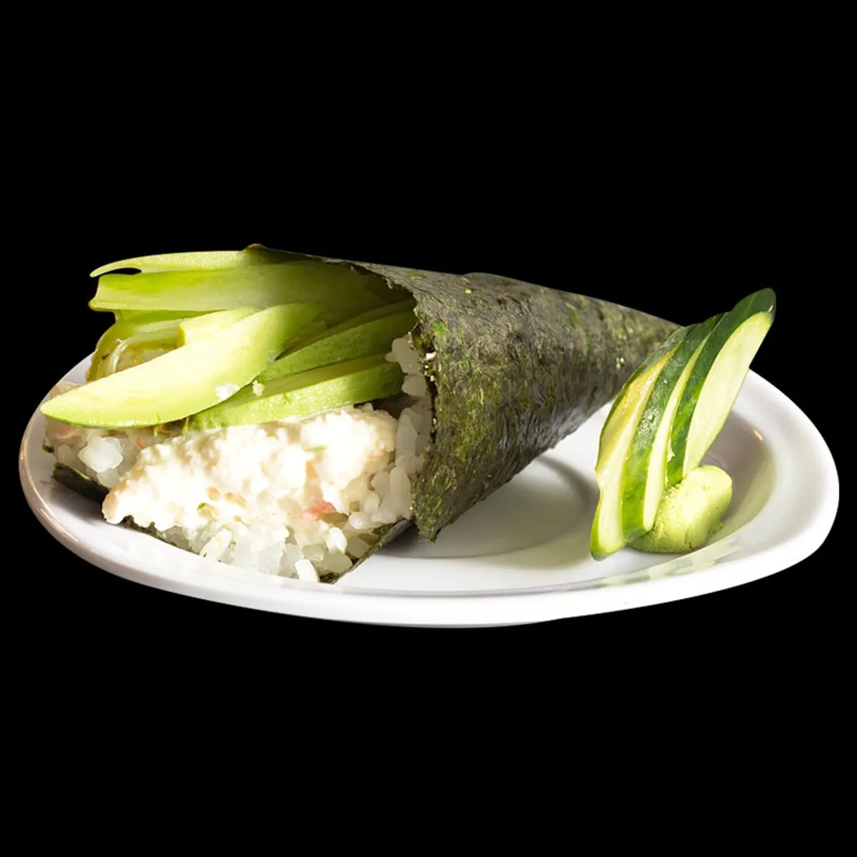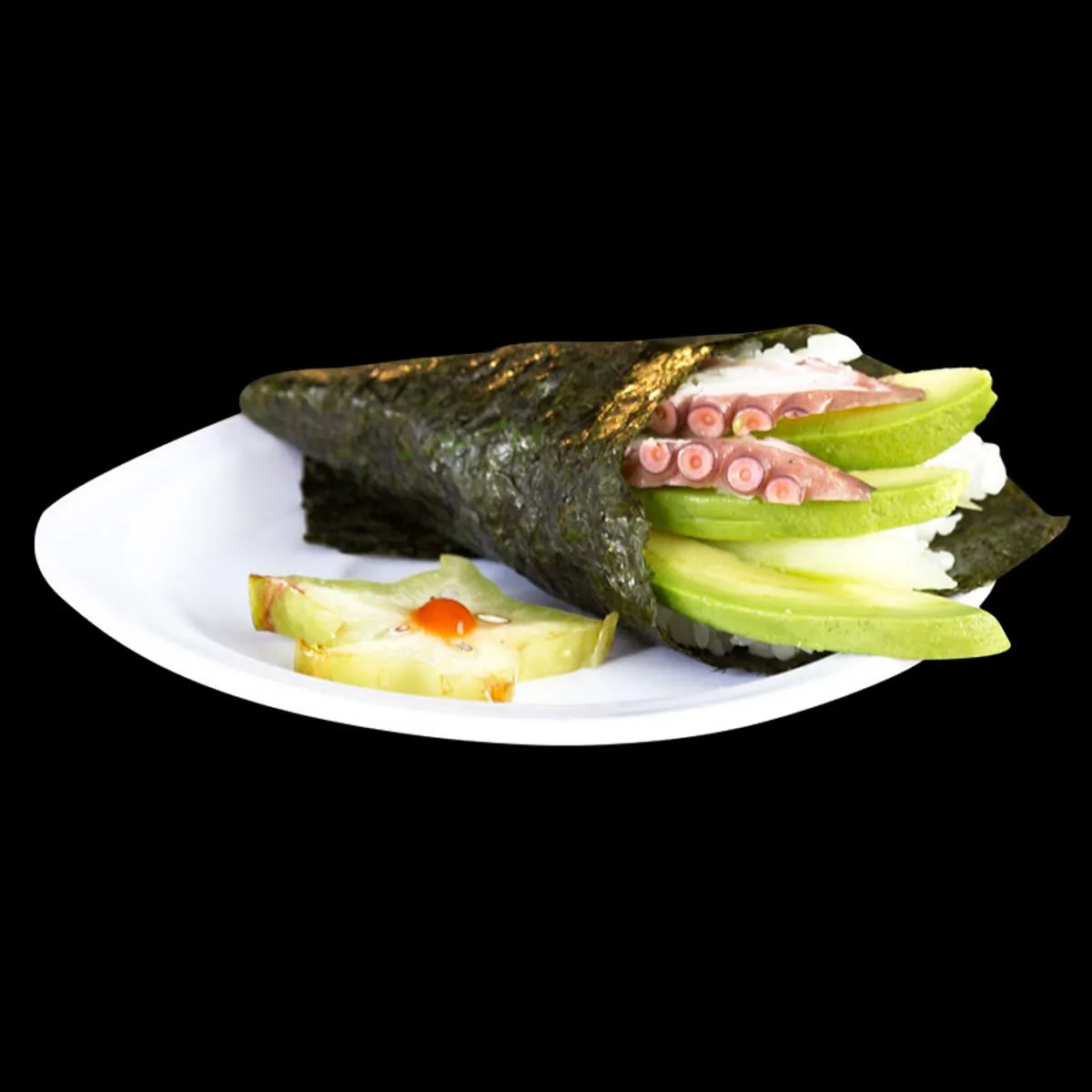 Cono de arroz envuelto en nori, queso crema, pepino, aguacate y pulpo