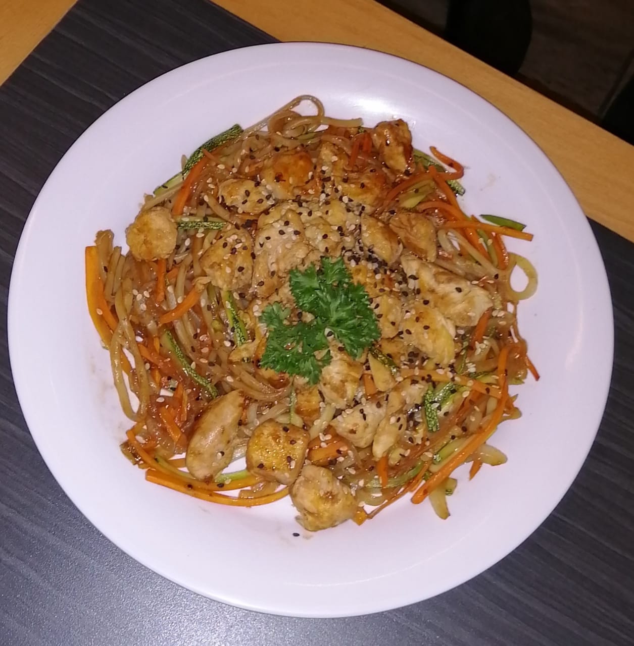 Pollo, res, camaron 160 gr tallarines de trigo, con verduras finamente picadas y salte