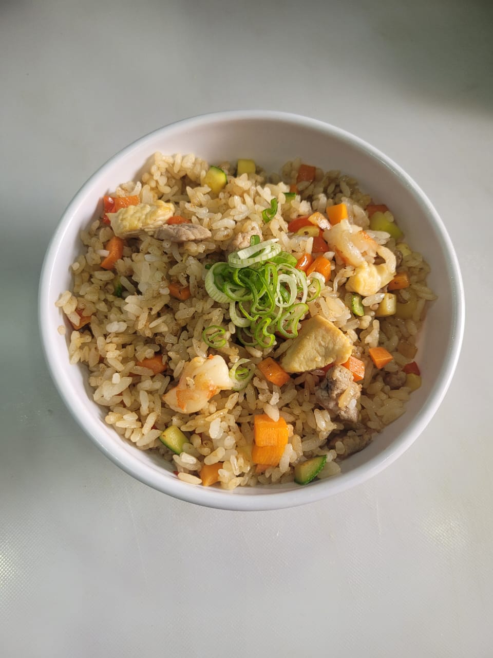 Arroz frito con verduras, pollo, res, camarón y cebollin