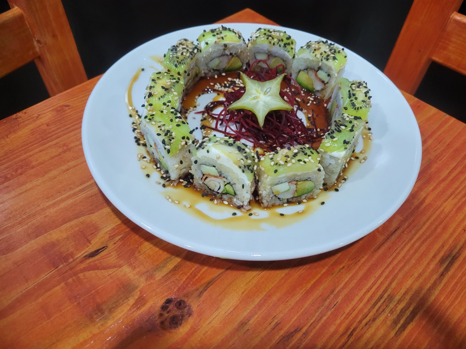 Surimi, capeado pepino y aguacate queso crema, y kiwi bañado en salsa dulce, con ajonjoli