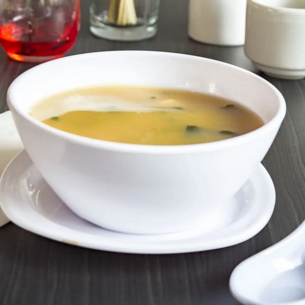 Sopa de pasta de soya con wakame, champiñon, hurusame, tofu y cebollin