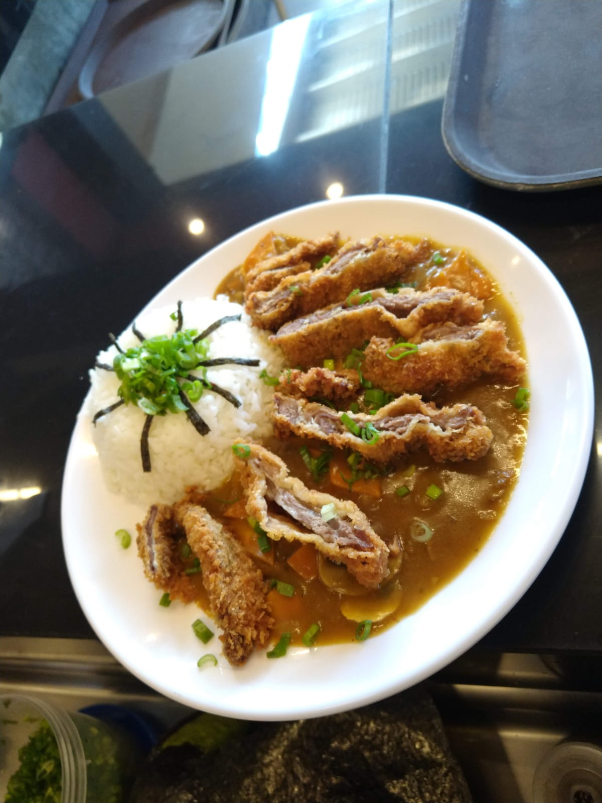 Arroz al vapor con salsa de curry, nori, champiñon, y proteina empanizada