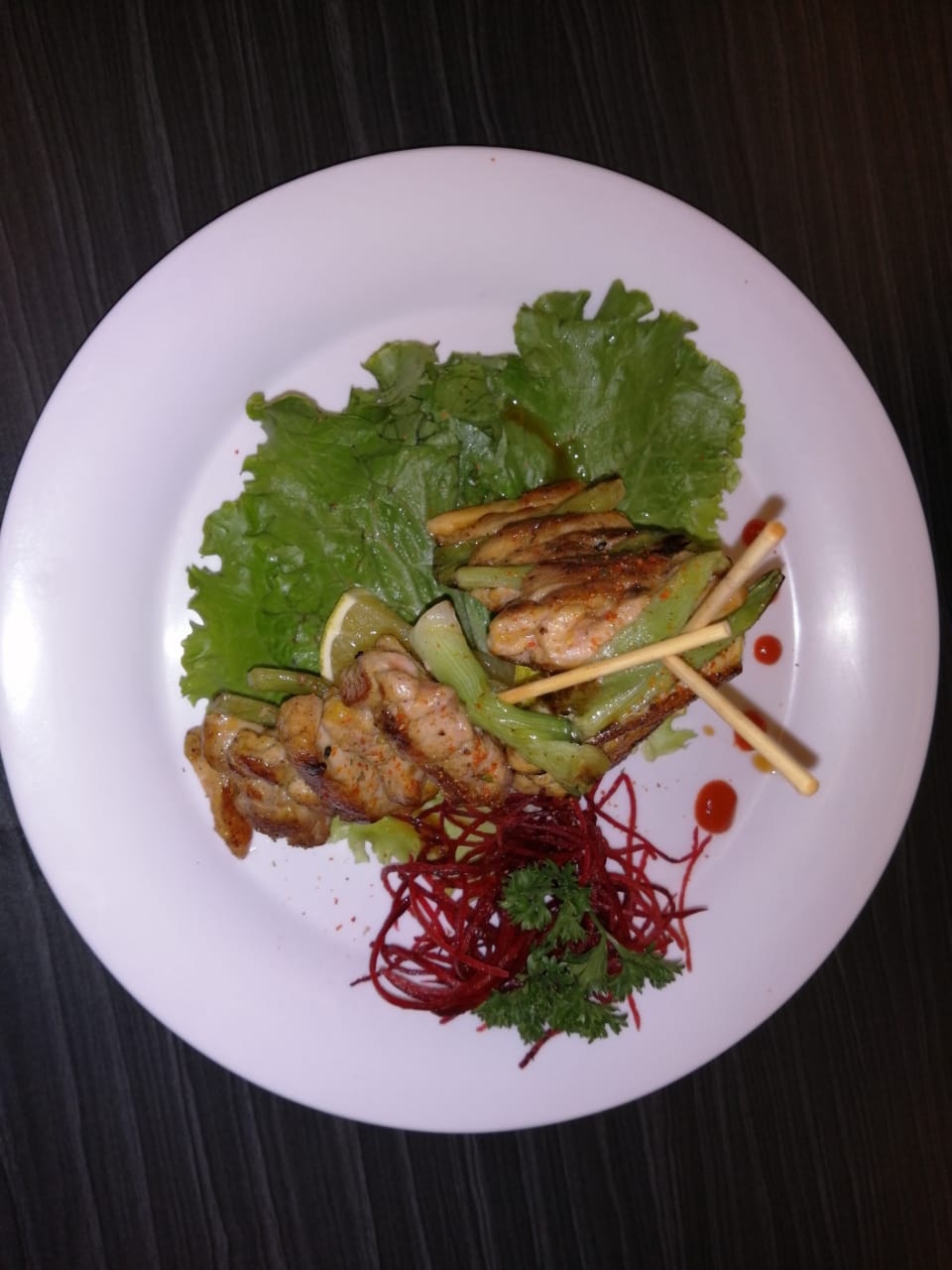 Brochetas de pollo, con cebolla cambray pimientos bañados en salsa agridulce, 3 pz