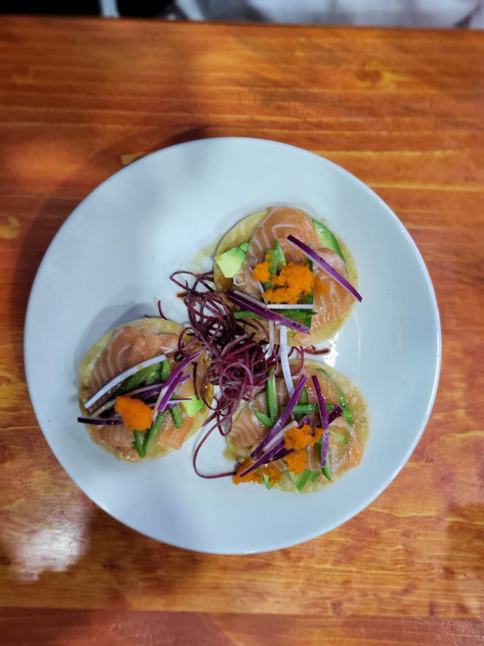 Tostadas de won-ton, salsa chiplote, salmón, aguacate, cebolla, jalapeños, masago, yuzu, ajipon 3 pz