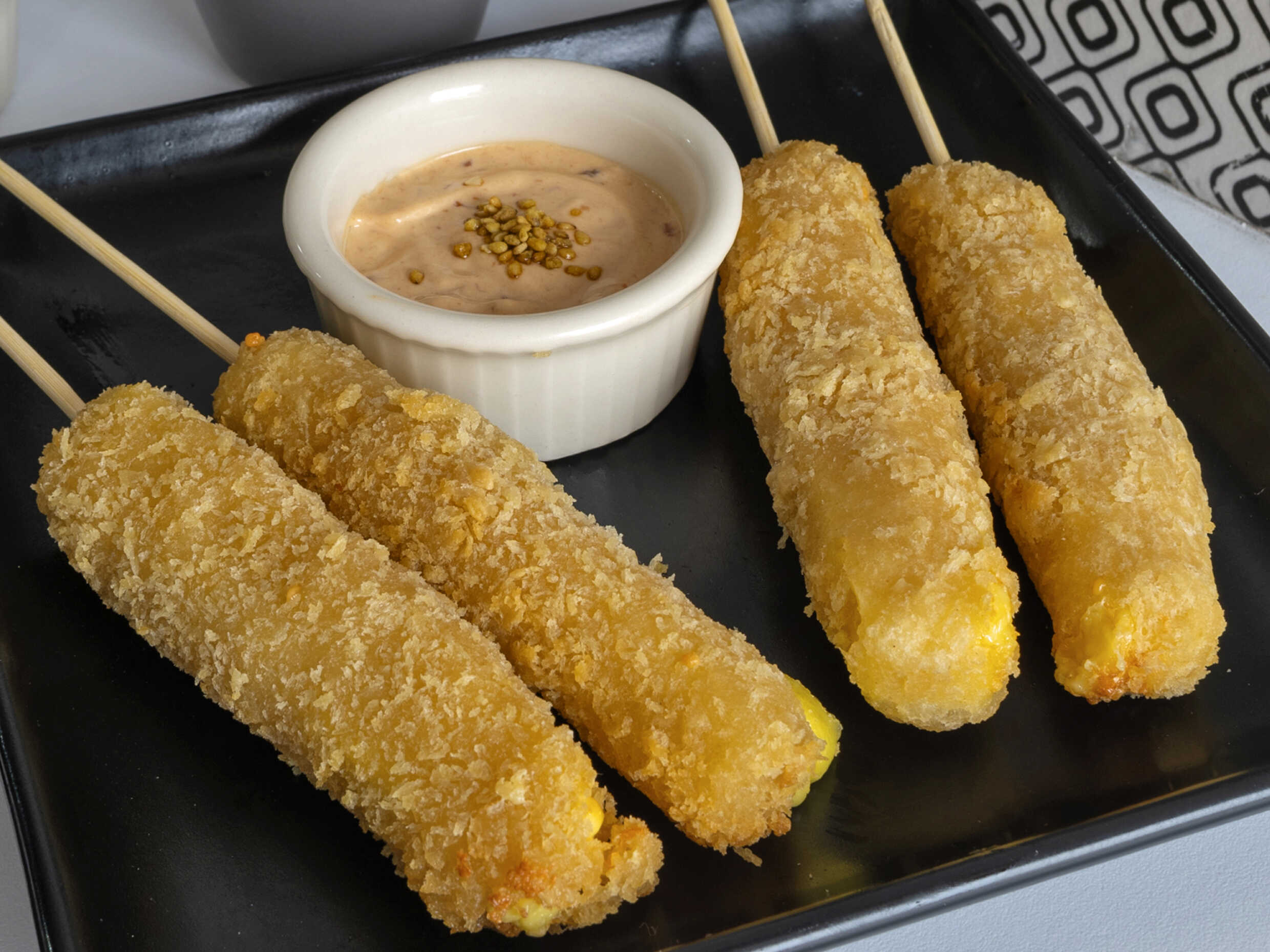 4 . Plátano empanizado acompañado de aderezo.