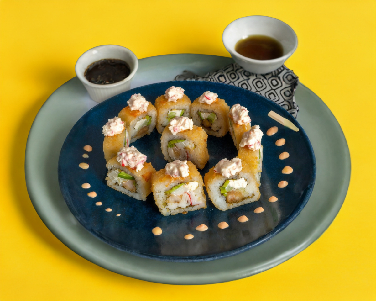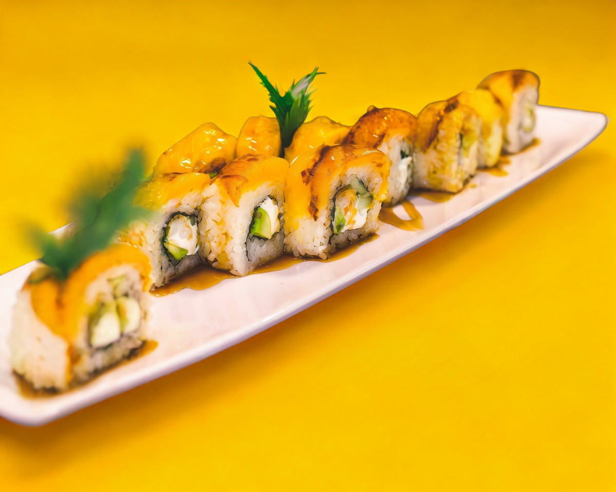 Queso Philadelphia, aguacate,pepino rodeado de salsa Tampico y salsa dulce