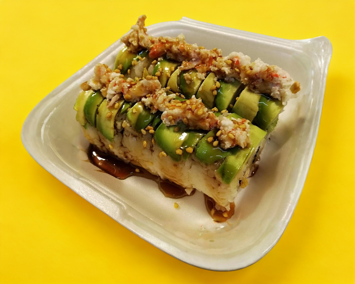 Cangrejo, pepino, aguacate y queso por fuera.