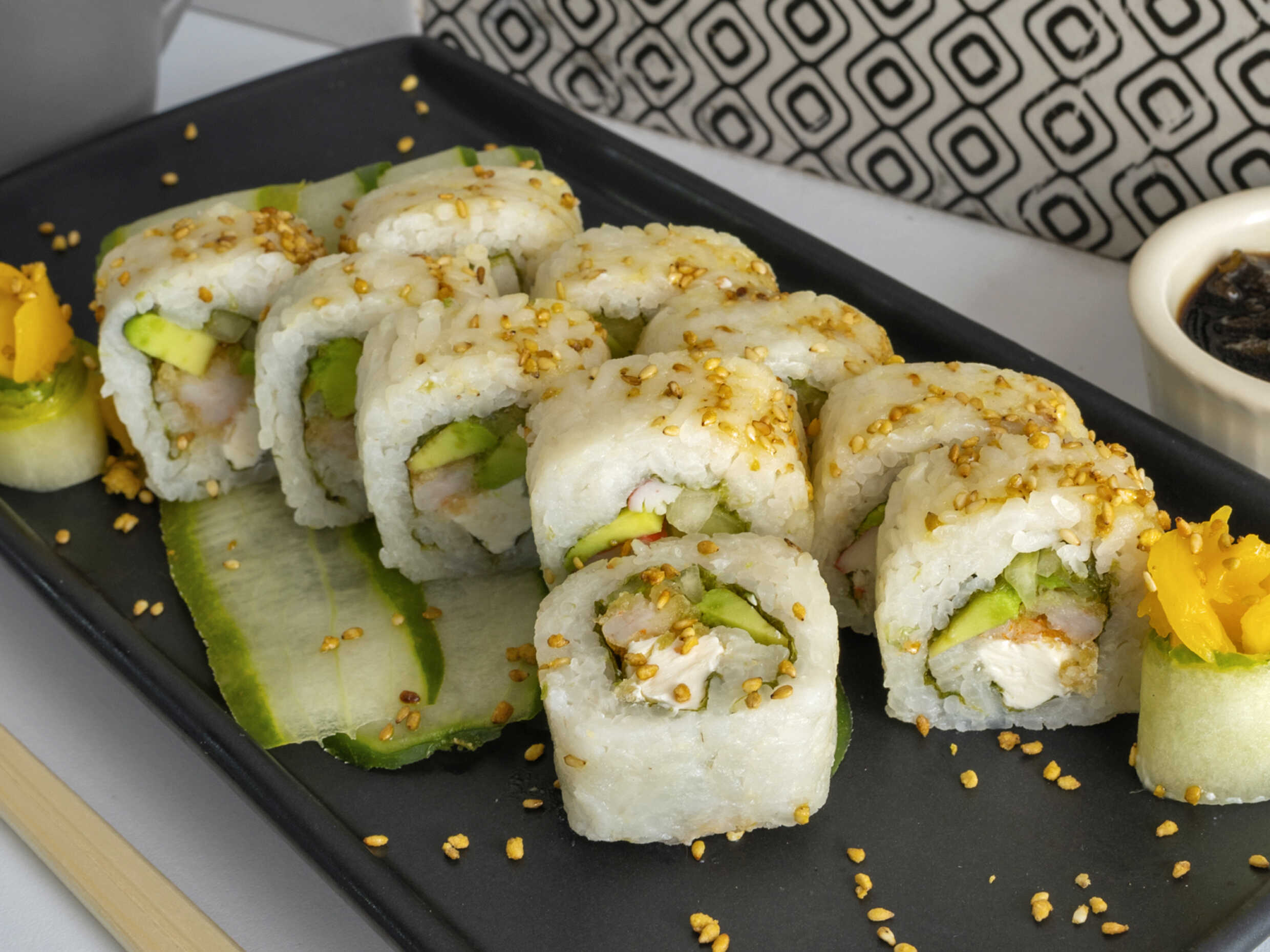Camarón, pepino, aguacate, queso Philadelphia con cangrejo importado y ajonjolí por fuera.