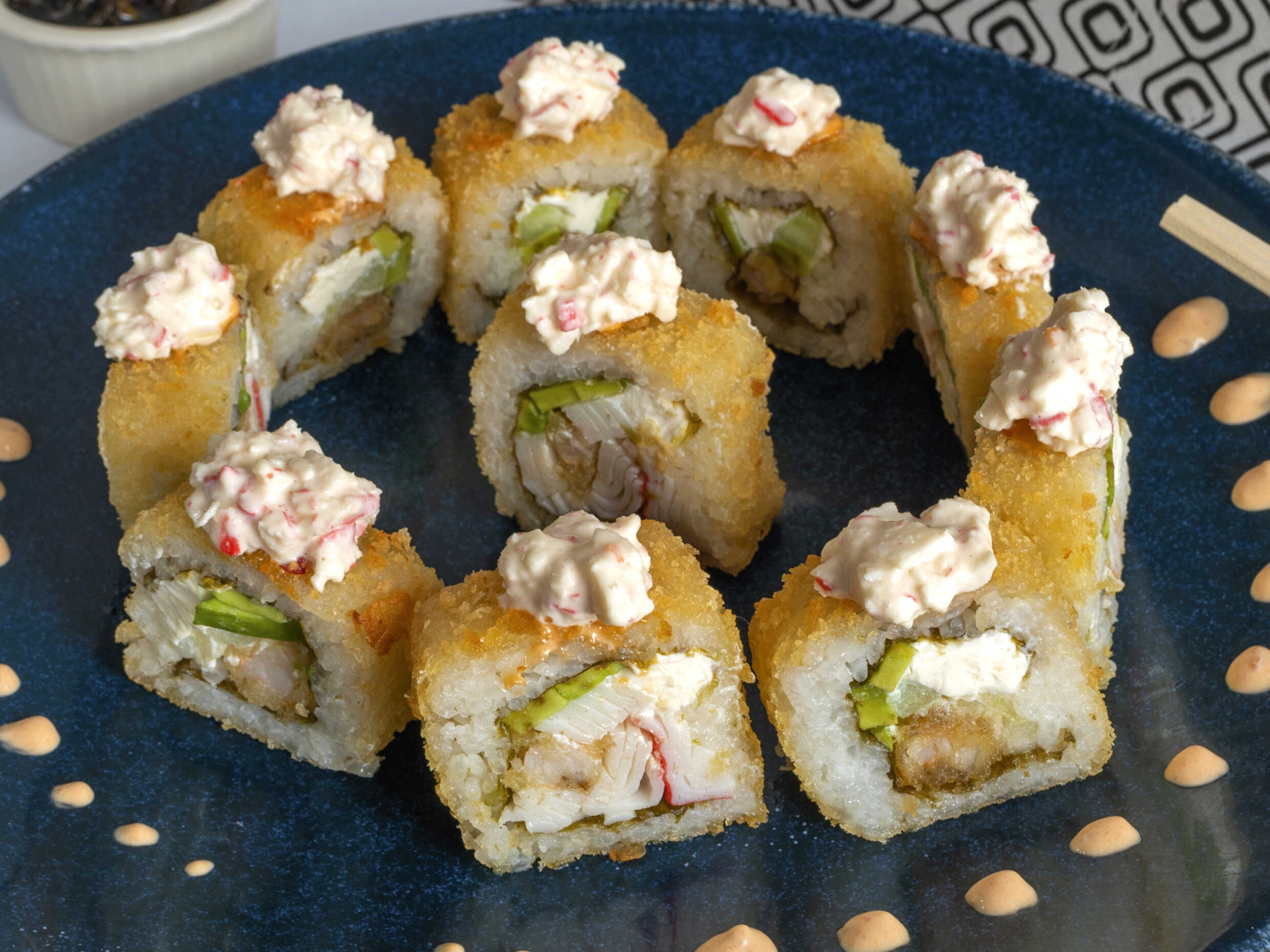 Camarón empanizado, queso Philadelphia,rodeado de aguacate con topping de Tampico,spicy,salsa dice y ajonjolí.