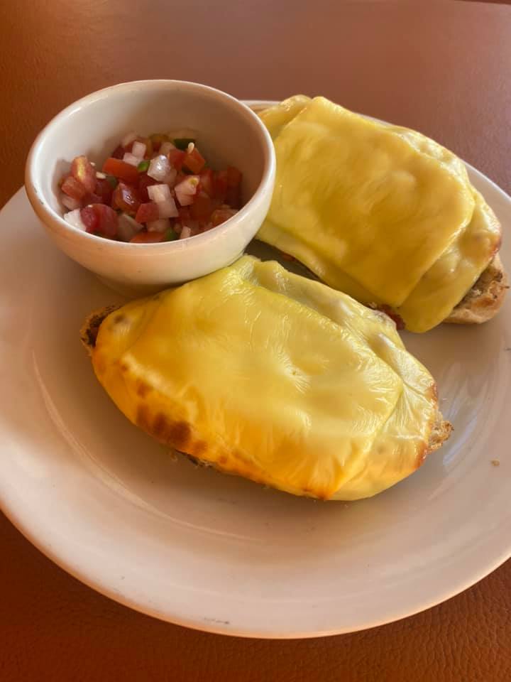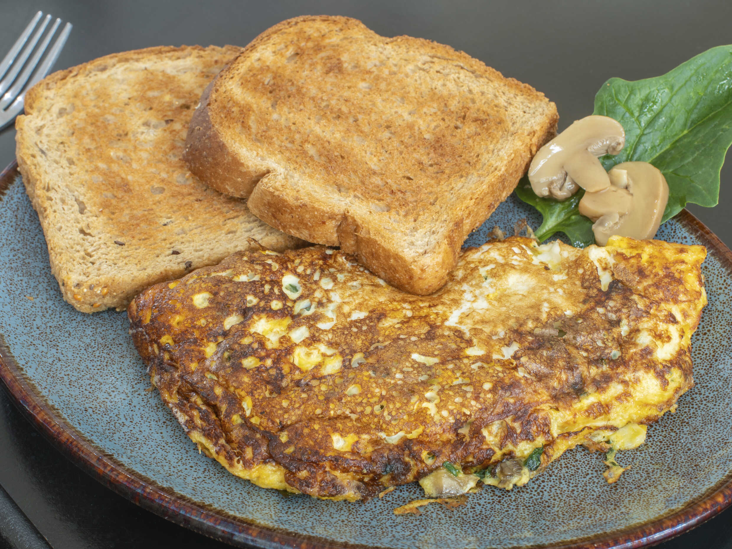 Incluye queso mozzarella dentro del omelette, con pan tostado.