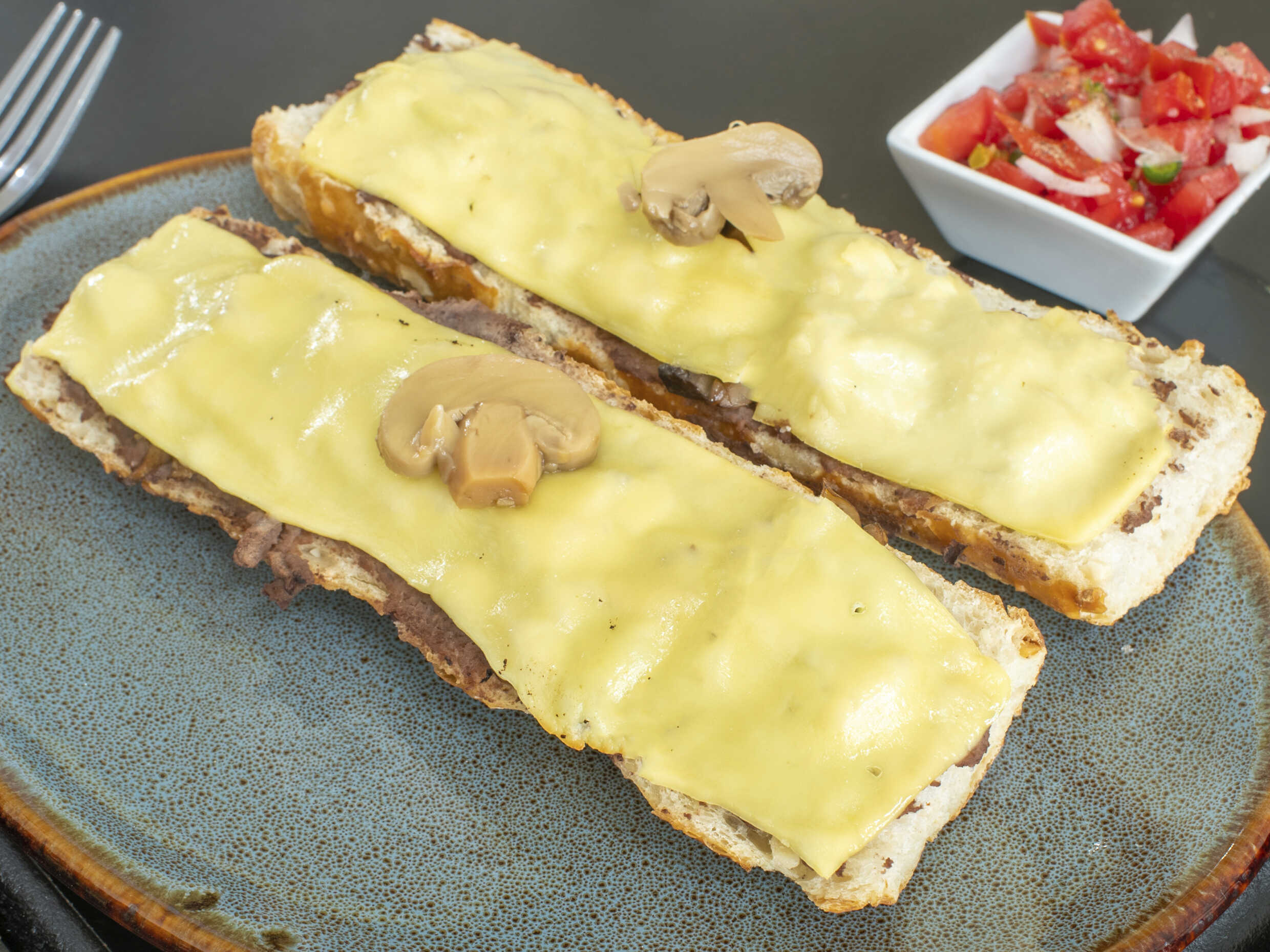 Queso crema, gouda, mozzarella, manchego, jitomate y germinado.