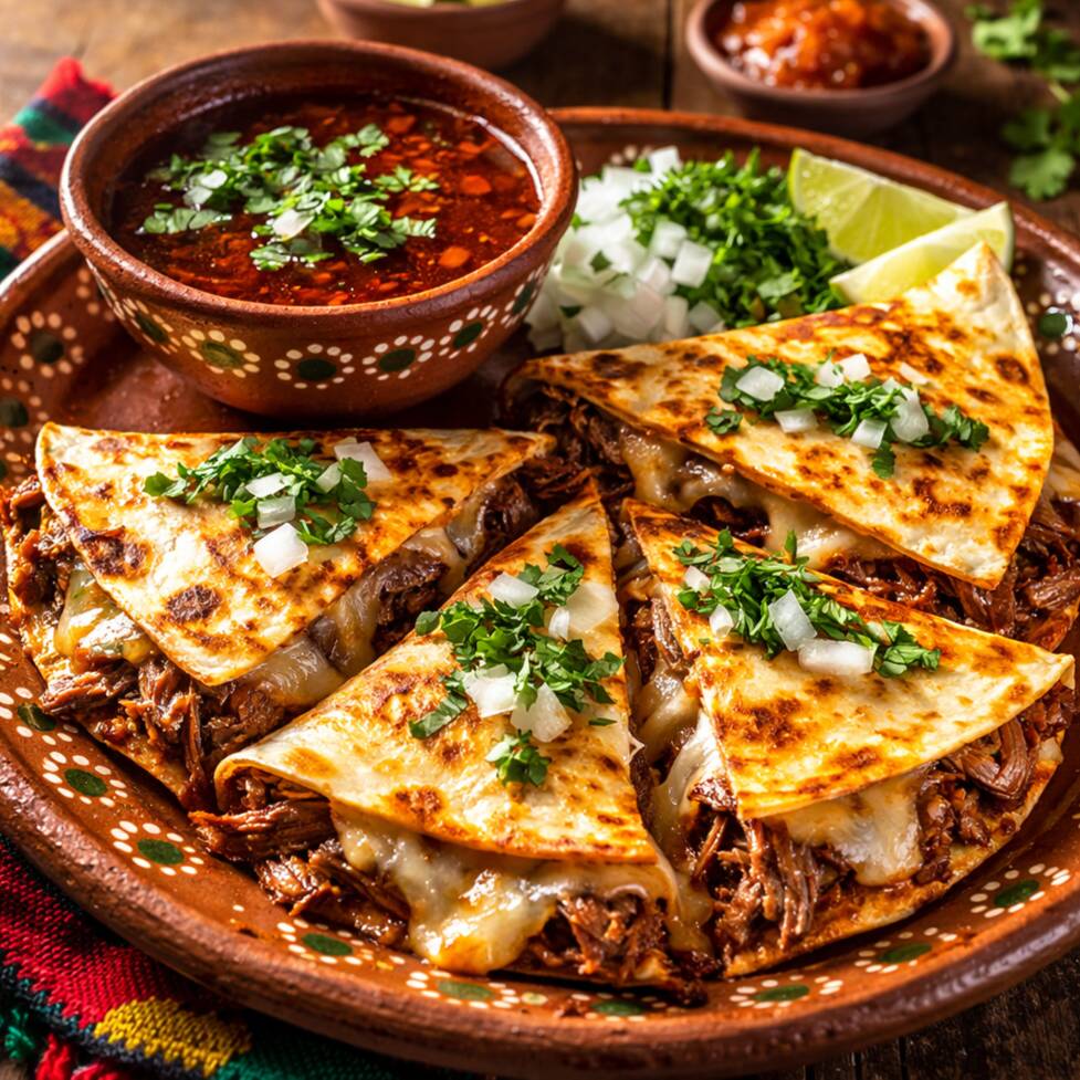QUESABIRRIA CON CARNE DE BIRRIA Y QUESO MANCHEGO GRATINADO, INCLUYE LIMON Y SALSA ESPECIAL DE LA CASA.