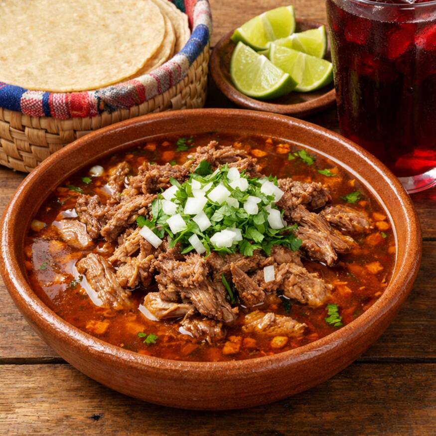 Deliciosa birria estilo Jalisco, servida en plato grande, con carne de birria. Incluye complementos : cebolla y cilantro picados, limón, salsa especial de la casa, orégano y tortillas.