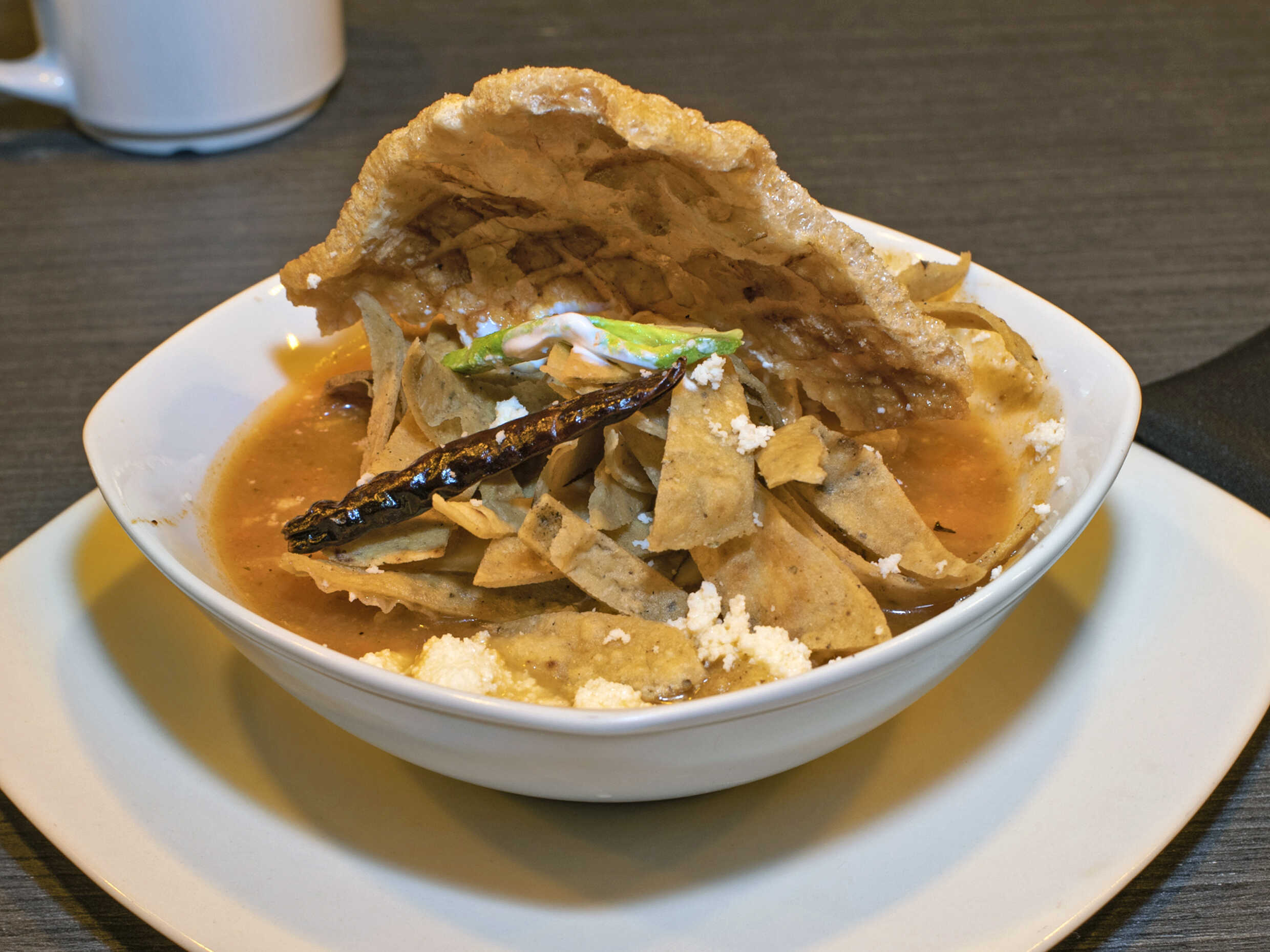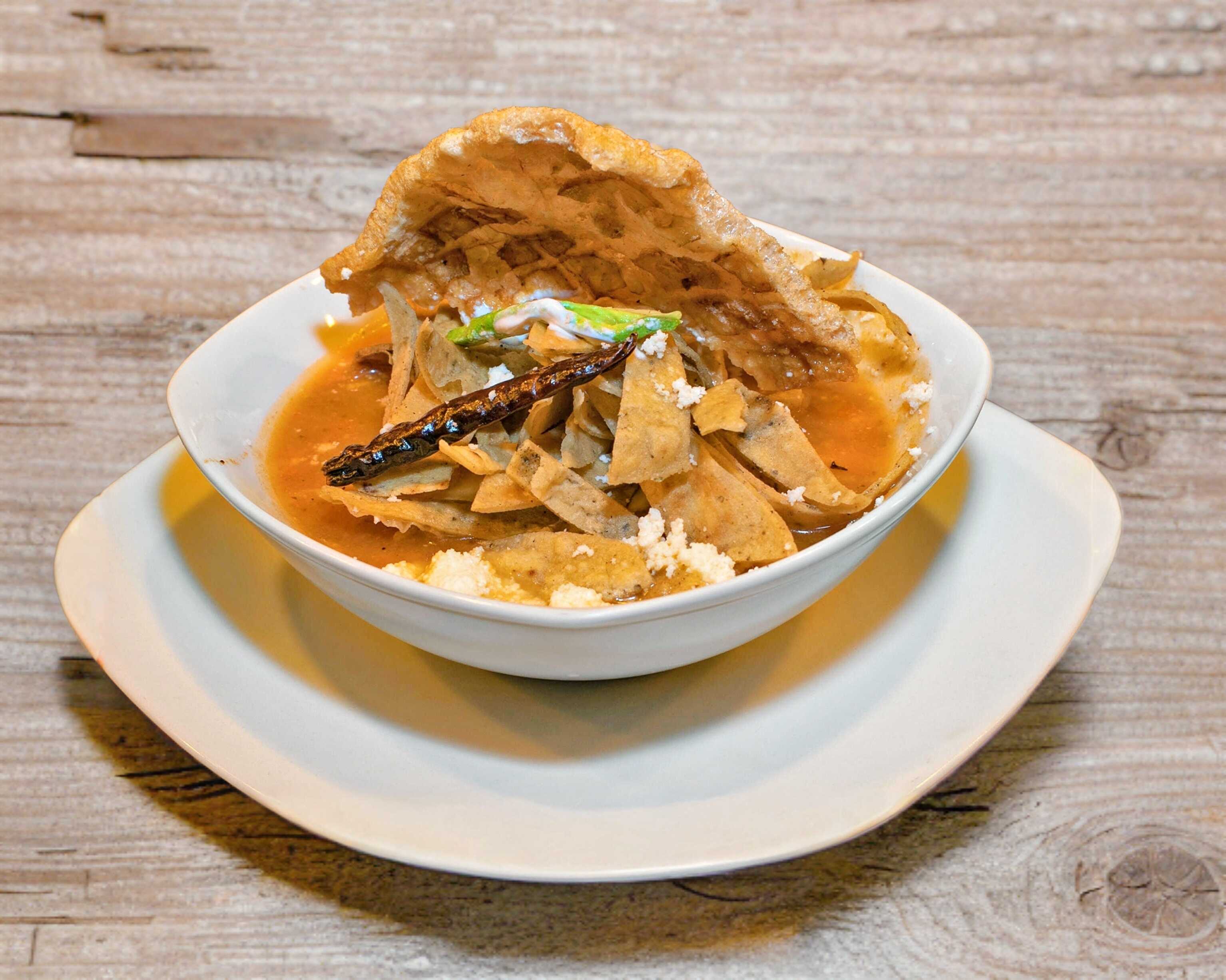 Crema, queso, chicharrón, chile de árbol, aguacate.
