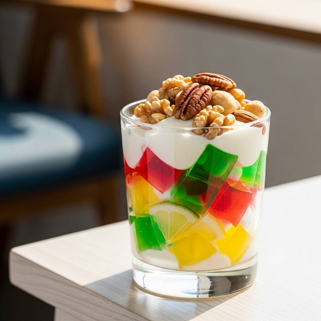POSTRE DE GELATINA EN CUBOS CON YOGURTH, CREMA, NUECES Y ARANDANOS