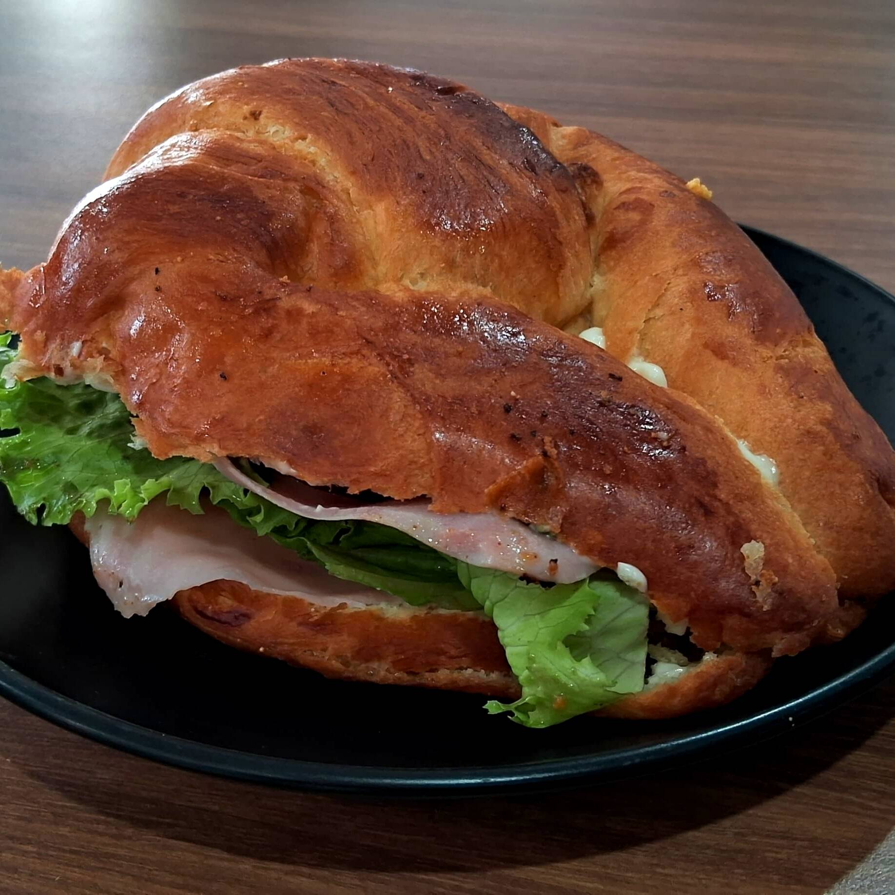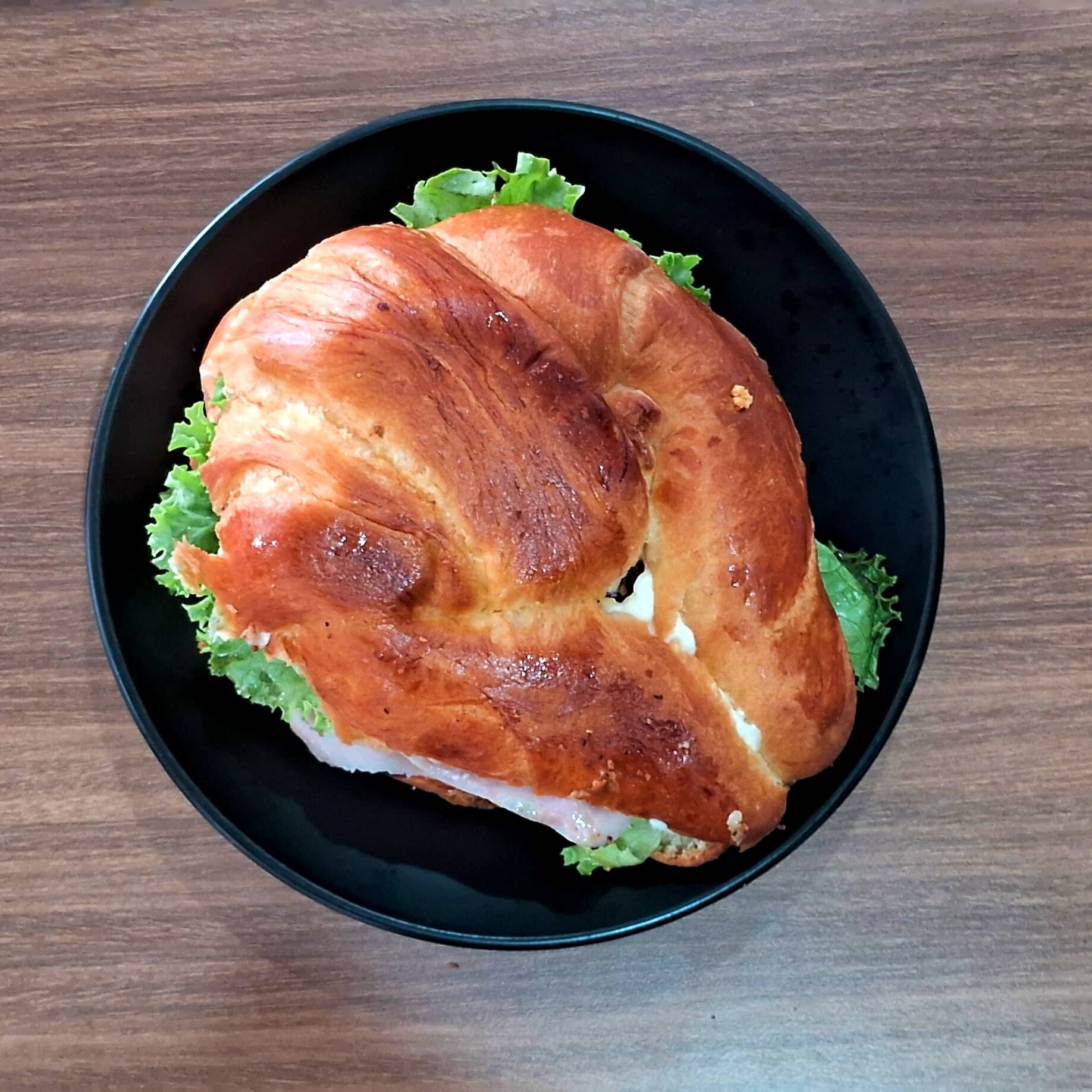 cuernito relleno de jamon, lechuga, jitomate, aguacate, queso amarillo y queso panela, incluye cafe de olla y 1 pan de dulce