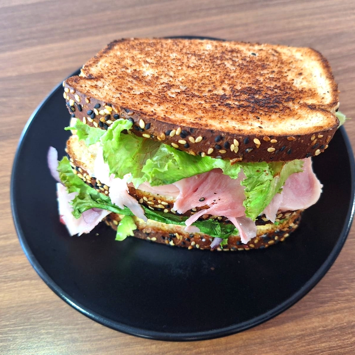 SANDWICH DE PAN INTEGRAL OROWETH CON LECHUGA, AGUACATE, JITOMATE, CEBOLLA, FRIJOLES, MAYONESA, QUESO PANELA, AMARILLO Y JAMON DE PIERNA, ASADO A LA PLANCHA