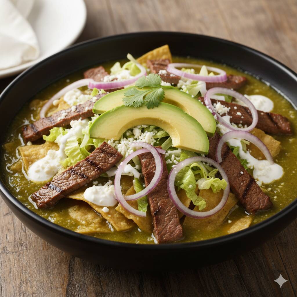 CHILAQUILES VERDES CON BISTECK ASADO, CON LECHUGA, CEBOLLA MORADA, AGUACATE, QUESO PANELA Y CREMA