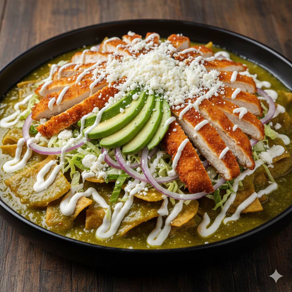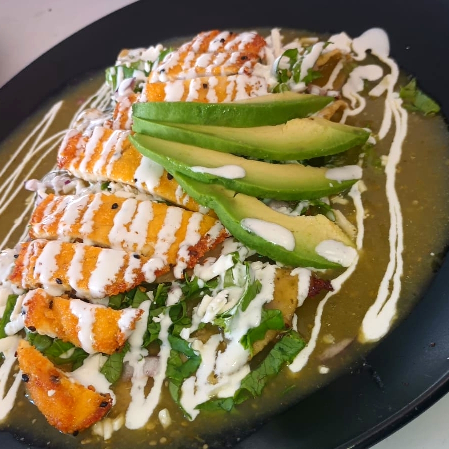 CHILAQUILES VERDES CON PECHUGA EMPANIZADA , CON LECHUGA, CEBOLLA MORADA, AGUACATE, QUESO PANELA Y CREMA