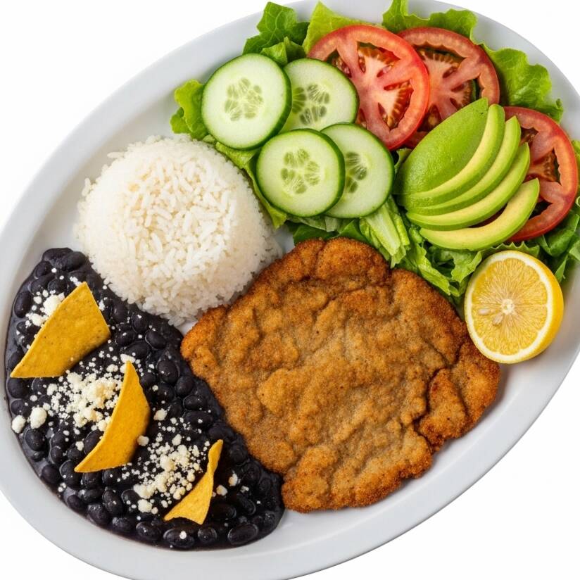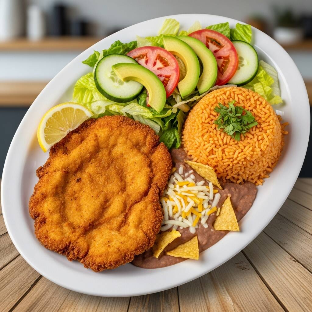 MILANESA DE RES CON COMPLEMENTOS DE ARROZ DEL DIA, FRIJOLES CHINOS DEL DIA, CON ENSALADA FRESCA DE LECHUGA, PEPINO, JITOMATE Y AGUACATE, INCLUYE 4 TORTILLAS Y SALSA DE MESA