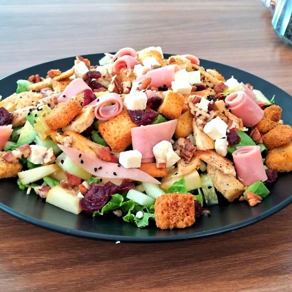 ENSALADA MIXTA CON, LECHUGA, PEPINO, MANZANA, JITOMATE, PECHUGA ASADA, JAMON DE PIERNA, QUESO PANELA, ARANDANOS, NUEZ, CRUTONES, ZANAHORIA, EL COMBO INCLUYE CAFÉ Y FRUTA