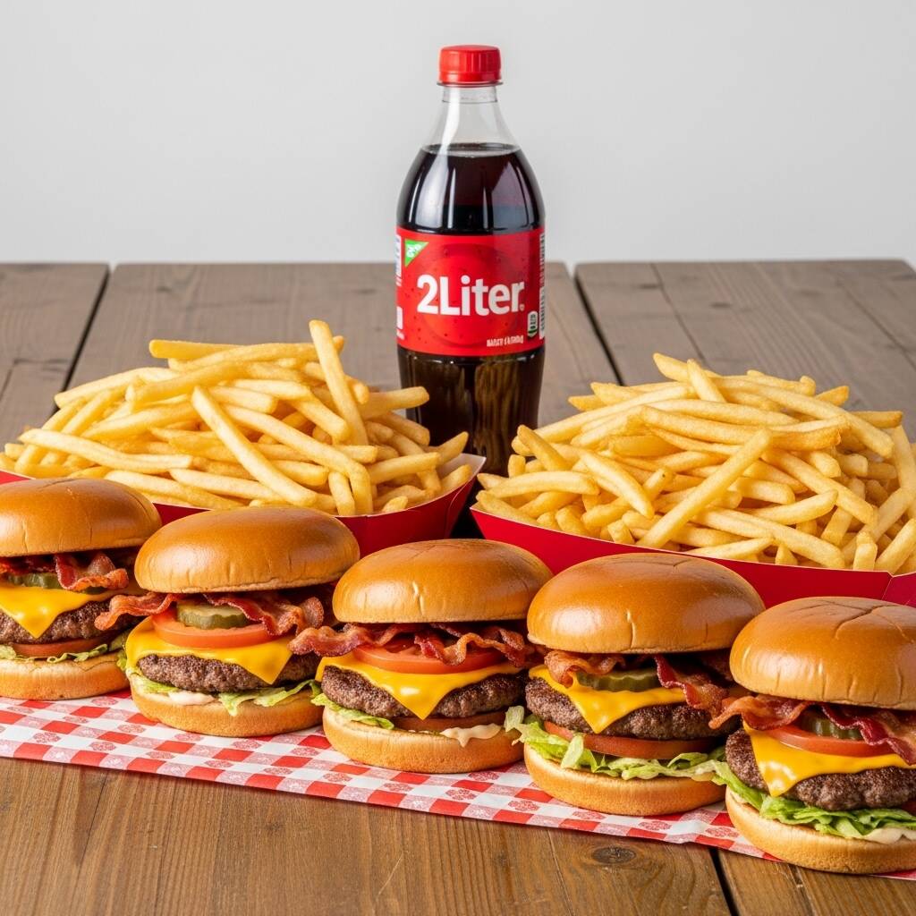 5 HAMBURGUESAS ESPECIALES DE TOCINO, 2 ORDENES DE PAPAS Y 1 REFRESCO DE 2 LITROS CON COMPLEMENTOS