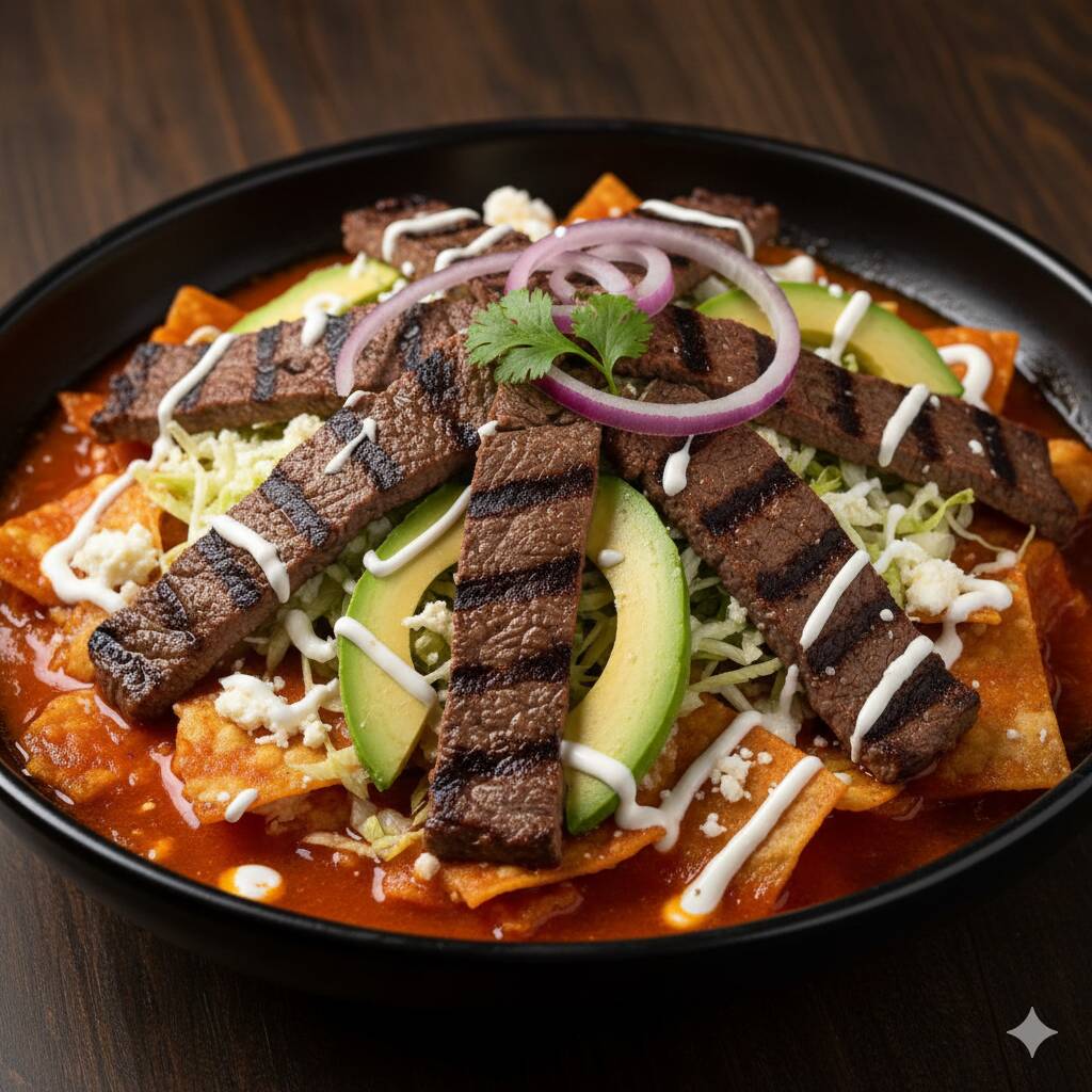 CHILAQUILES ROJOS CON BISTECK ASADO, CON LECHUGA, CEBOLLA MORADA, AGUACATE, QUESO PANELA Y CREMA