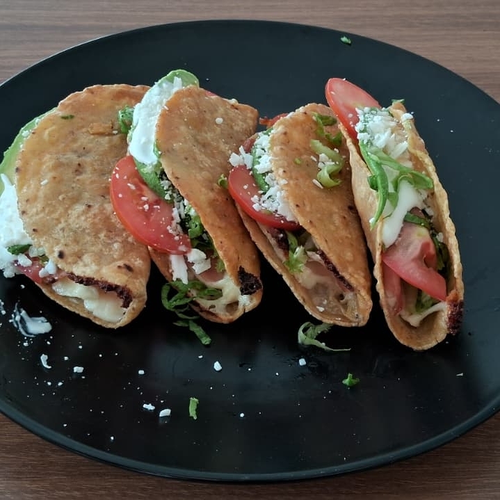 4 TULANCINGUEÑAS DORADAS, RELLENAS DE QUESILLO, JAMON, QUESO AMARILLO, AGUACATE, JITOMATE, LECHUGA, QUESO Y CREMA CON SALSA DE LA CASA