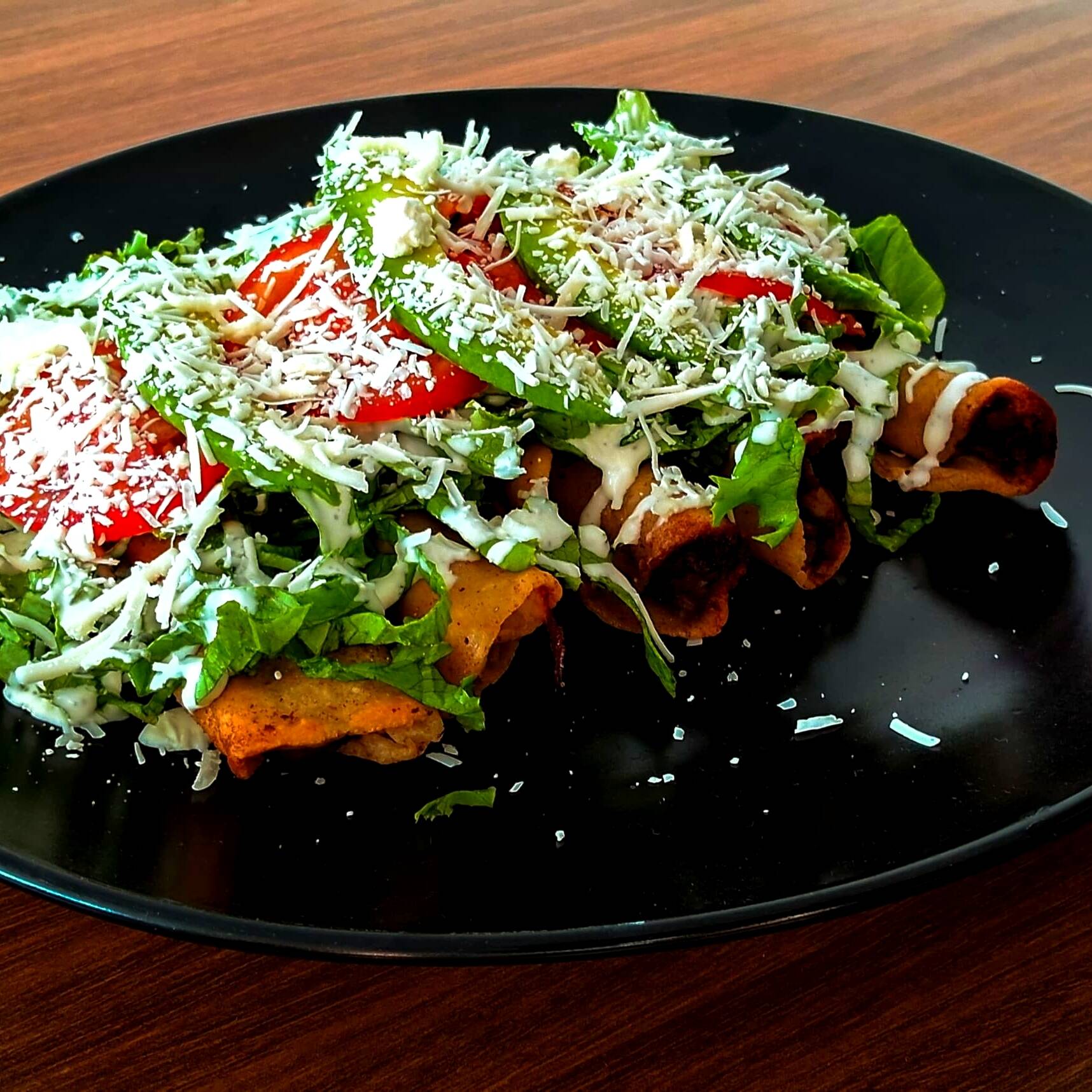 4 ENCHILADAS RELLENAS DE QUESO DE HEBRA, CON SALSA VERDE PICOSITA, LECHUGA, CEBOLLA MORADA, AGUACATE, QUESO, CREMA Y POLLO DESHEBRADO