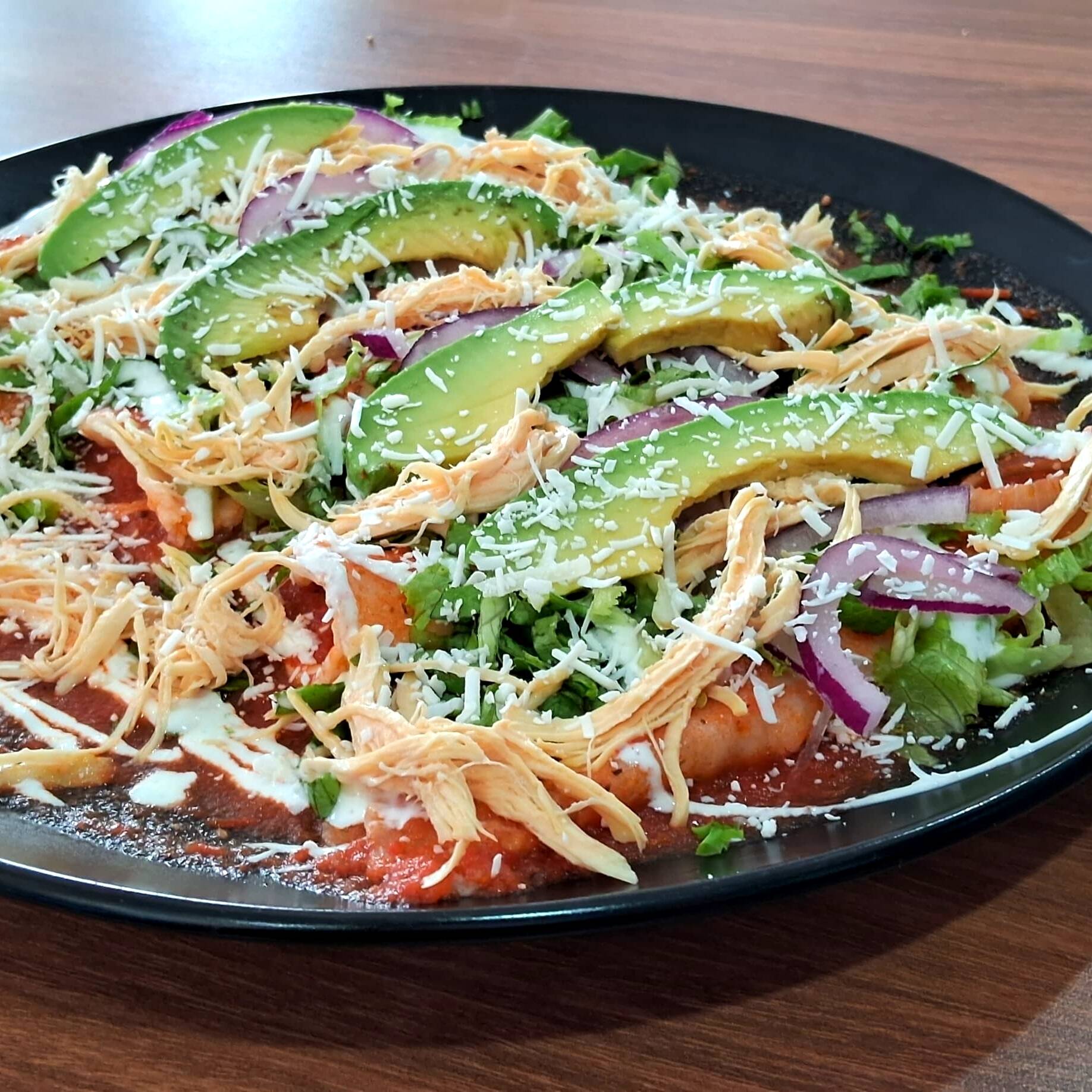 Chilaquiles con salsa roja no tan picante, lechuga, cebolla morada, aguacate, queso panela, crema y de proteina pollo deshebrado