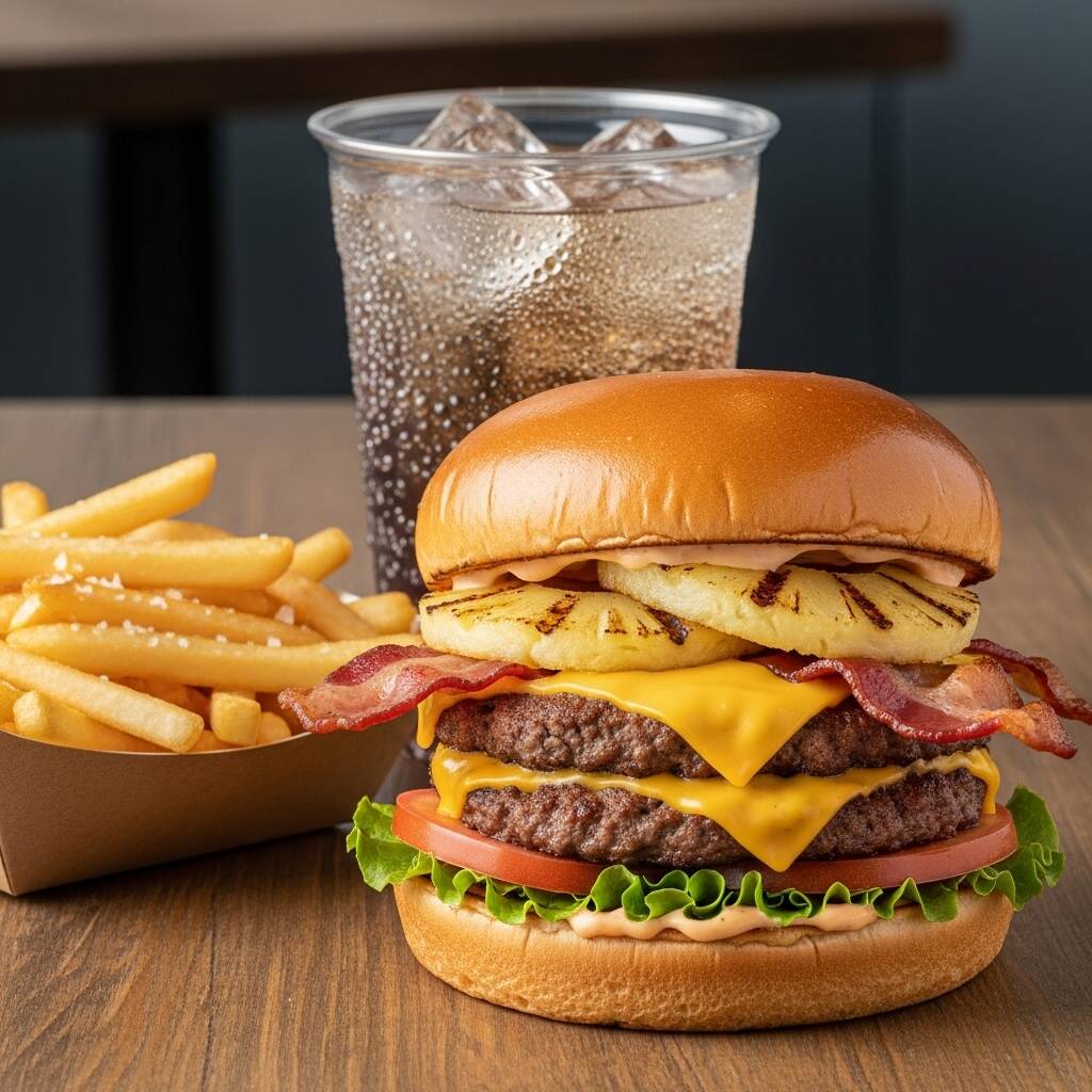 HAMBURGUESA CON DOBLE CARNE, PIÑA, TOCINO, PAPAS Y REFRESCO DE 355ML